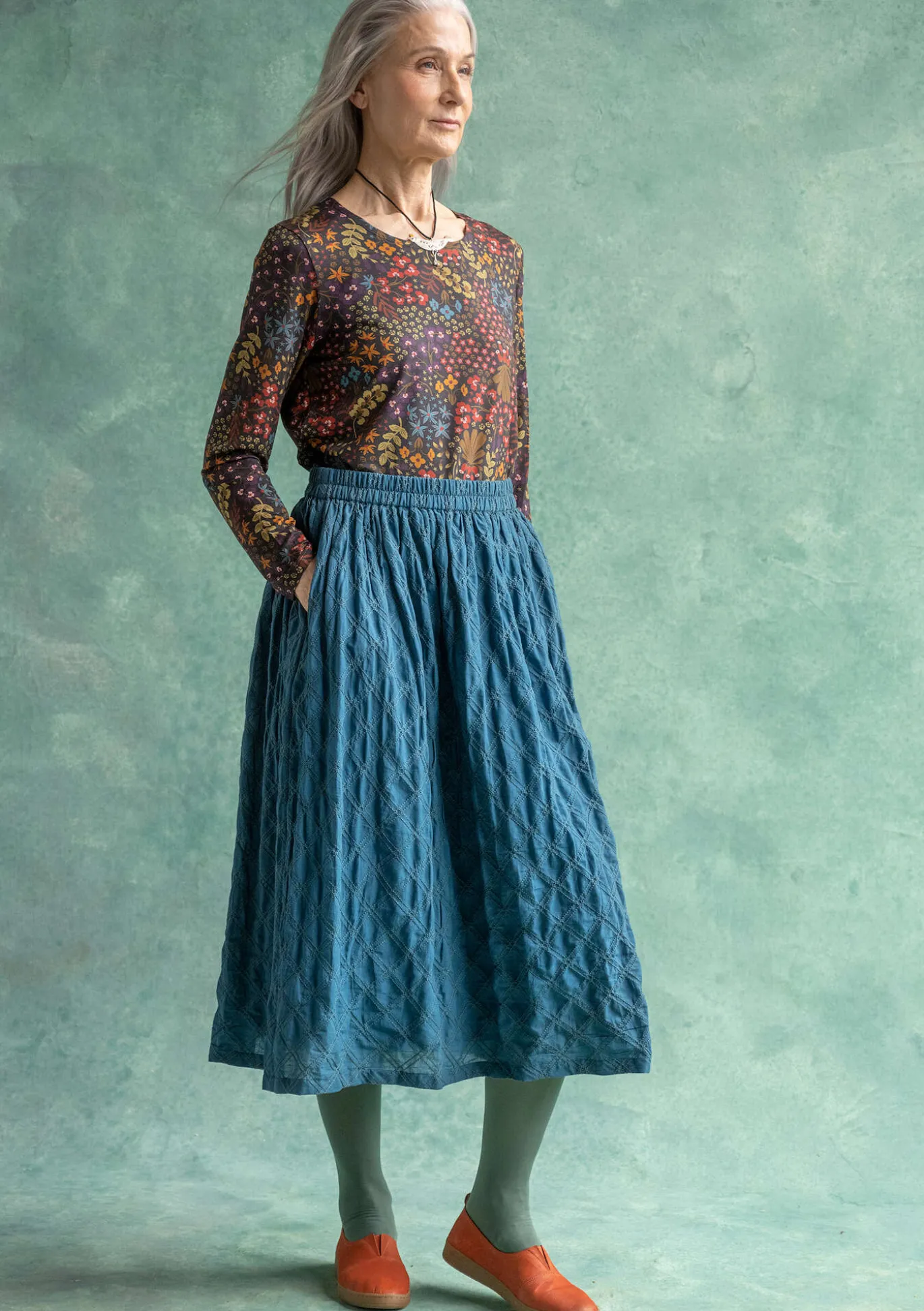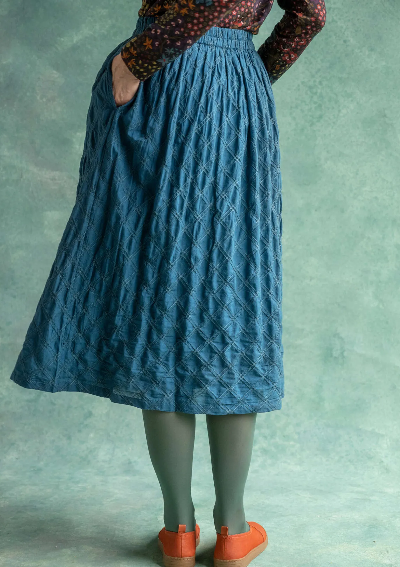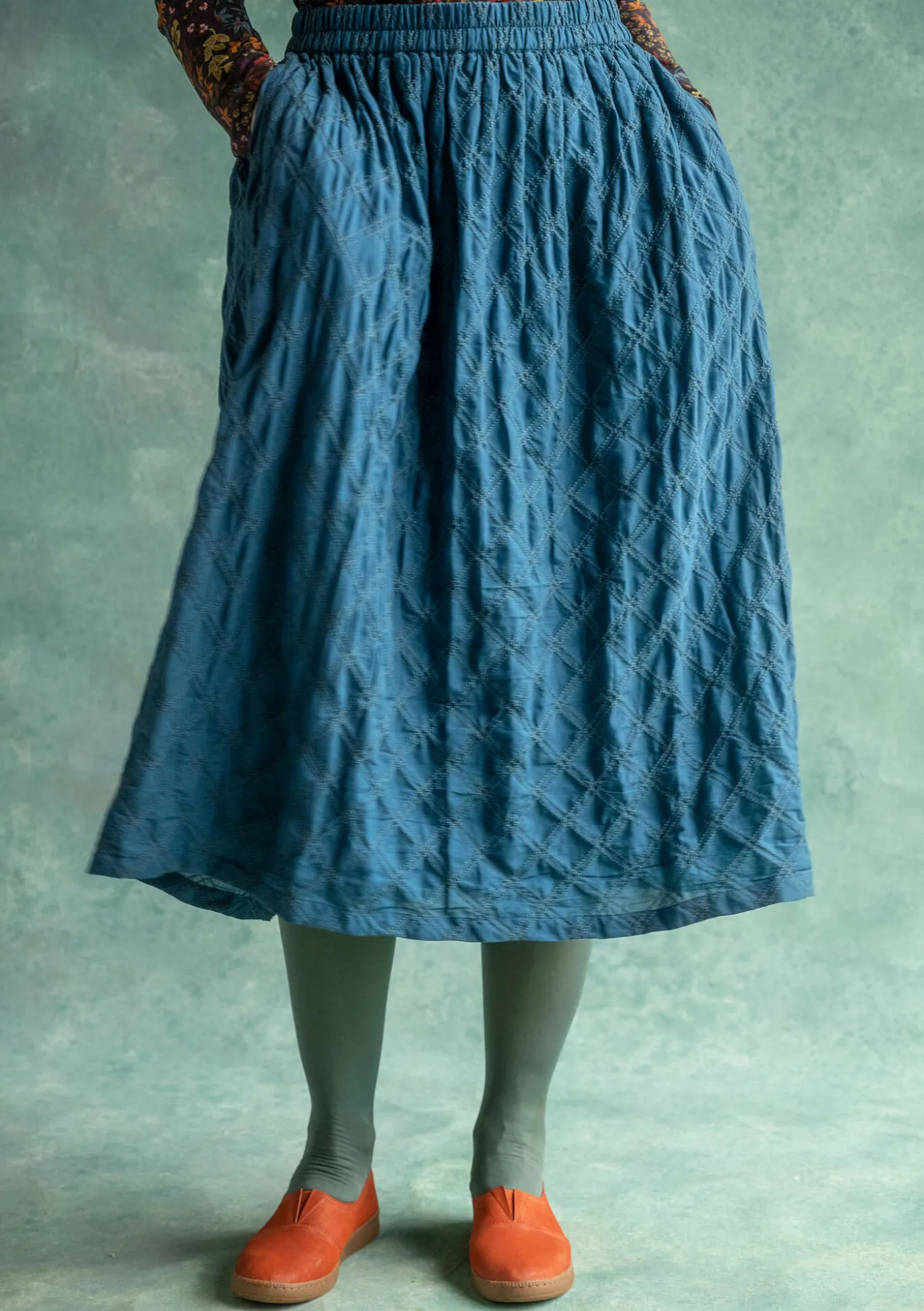 Kauttaaltaan kirjailtu hame, jossa on hieno ruutukuvio sävy sävyyn. Vyötäröllä ommeltu resori, sivuissa käytännölliset taskut.