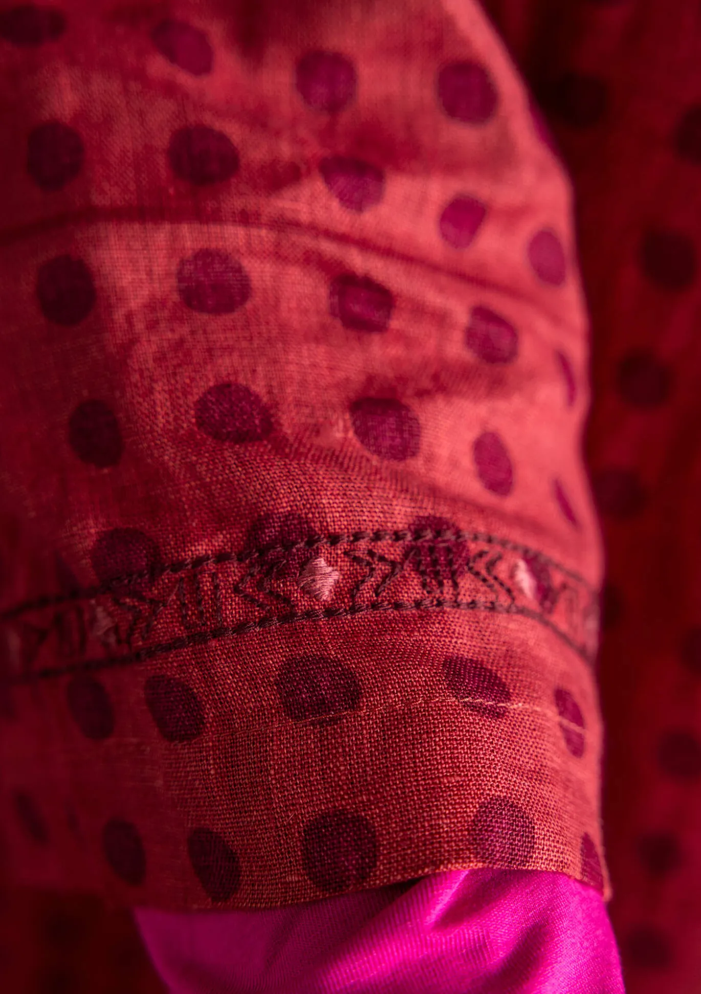 Edessä ja takana v-mallinen kaarroke. Edessä nappikiinnitys sekä helmalle lisäväljyyttä antava pieni laskos. Puolipitkien hihojen hihansuissa on kirjailtu somiste. Sivuissa piilotaskut.