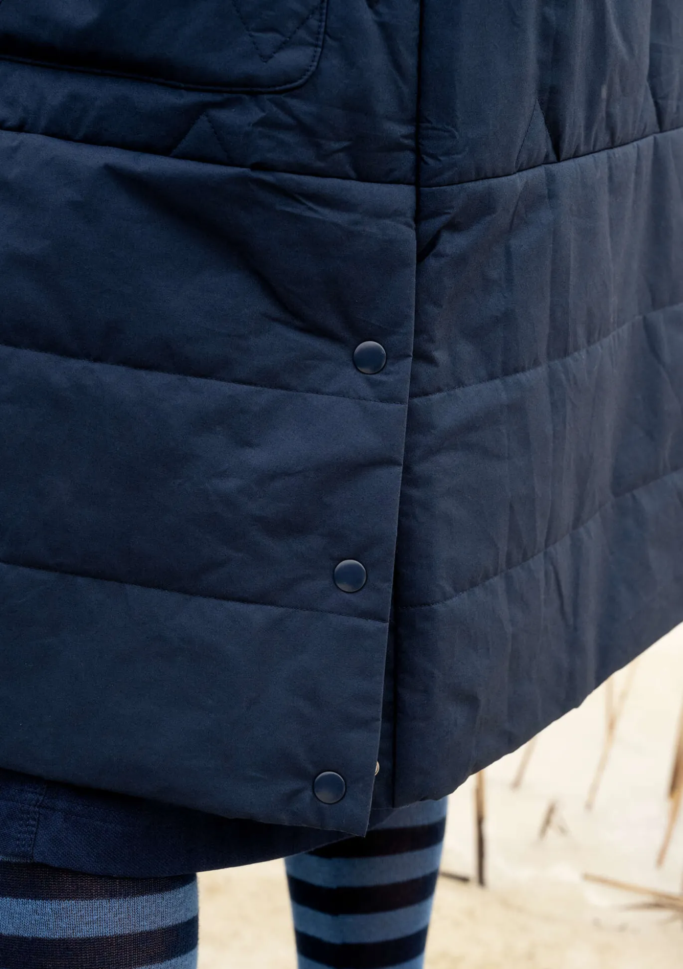 Tikatussa kokovuorillisessa takissa on kokopitkät hihat ja painonapeilla suljettavat sivuhalkiot. Edessä keskellä piilovetoketju ja nappilista. Reilunkokoiset taskut ja hihansuissa piiloresori. Pääntiessä, hihansuissa ja hupun reunassa koristeellisia kirjailuja.