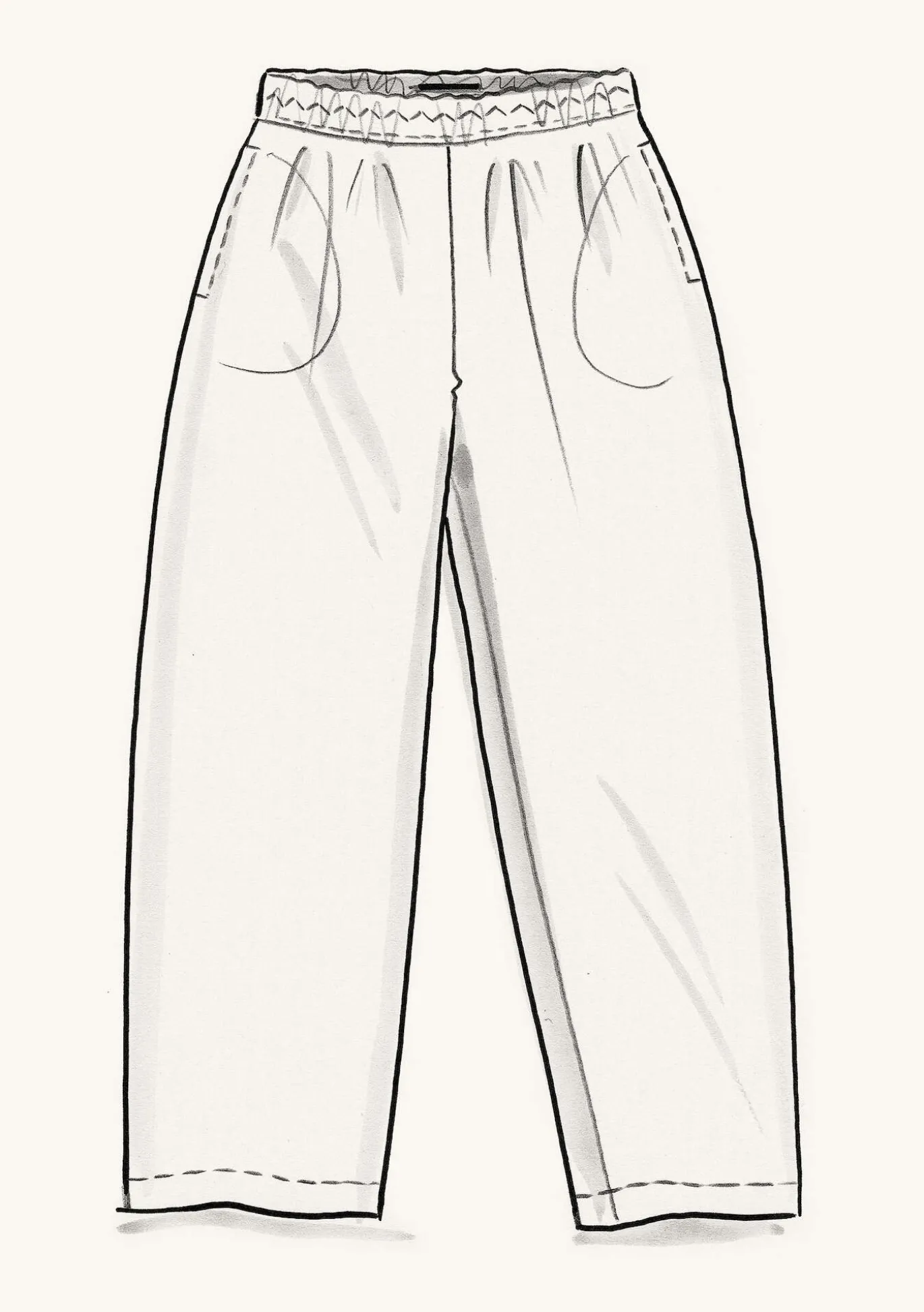 Nilkkapituinen malli, jossa on resori vyötäröllä ja sivutaskut.