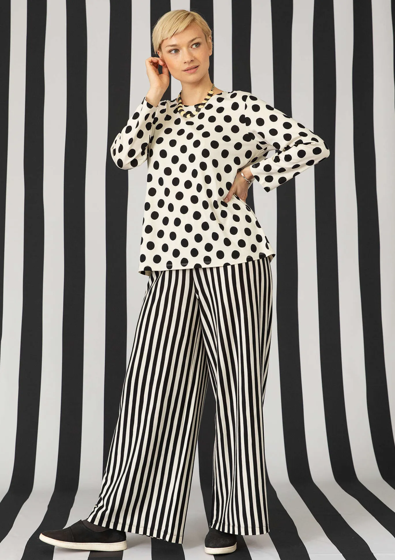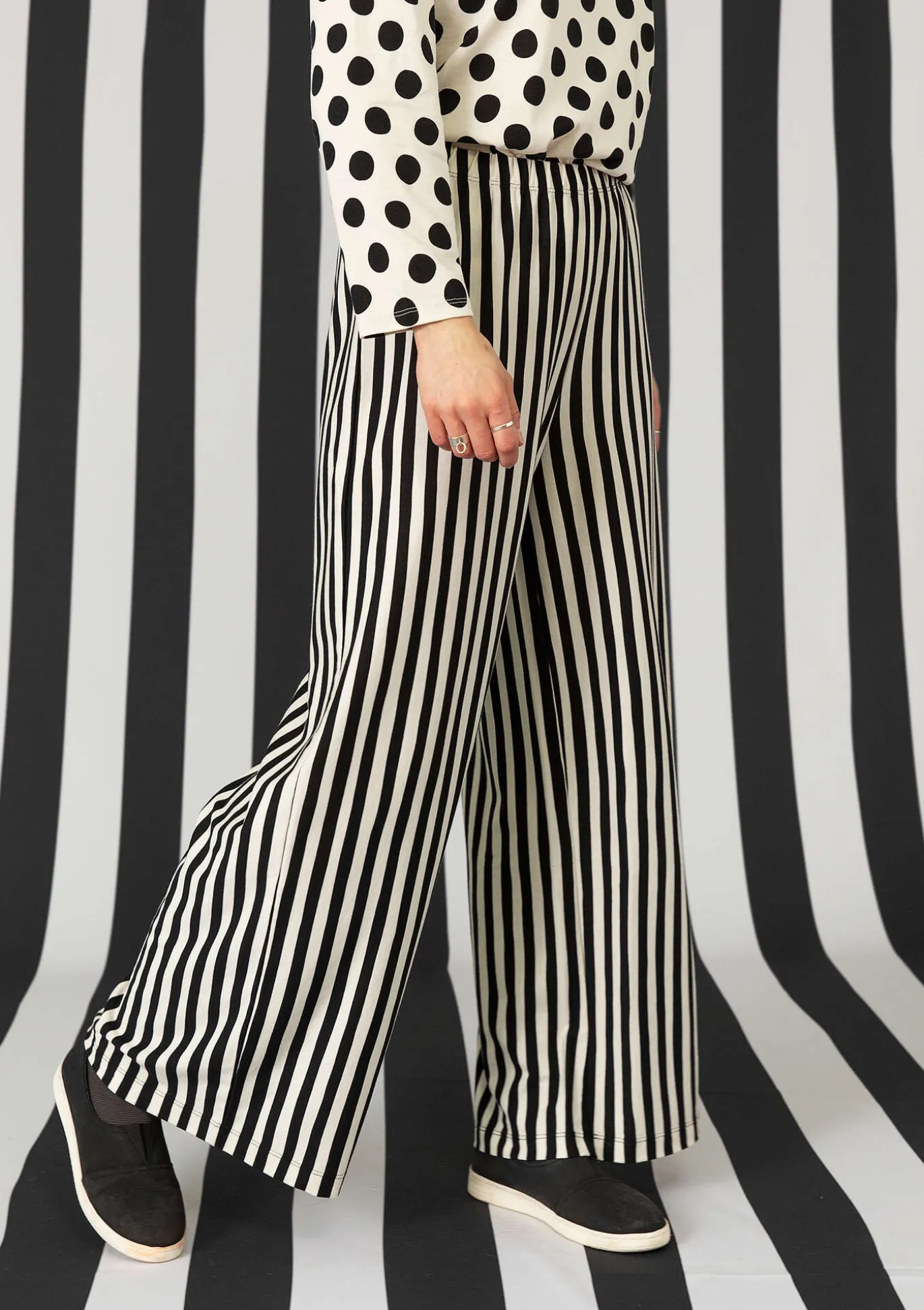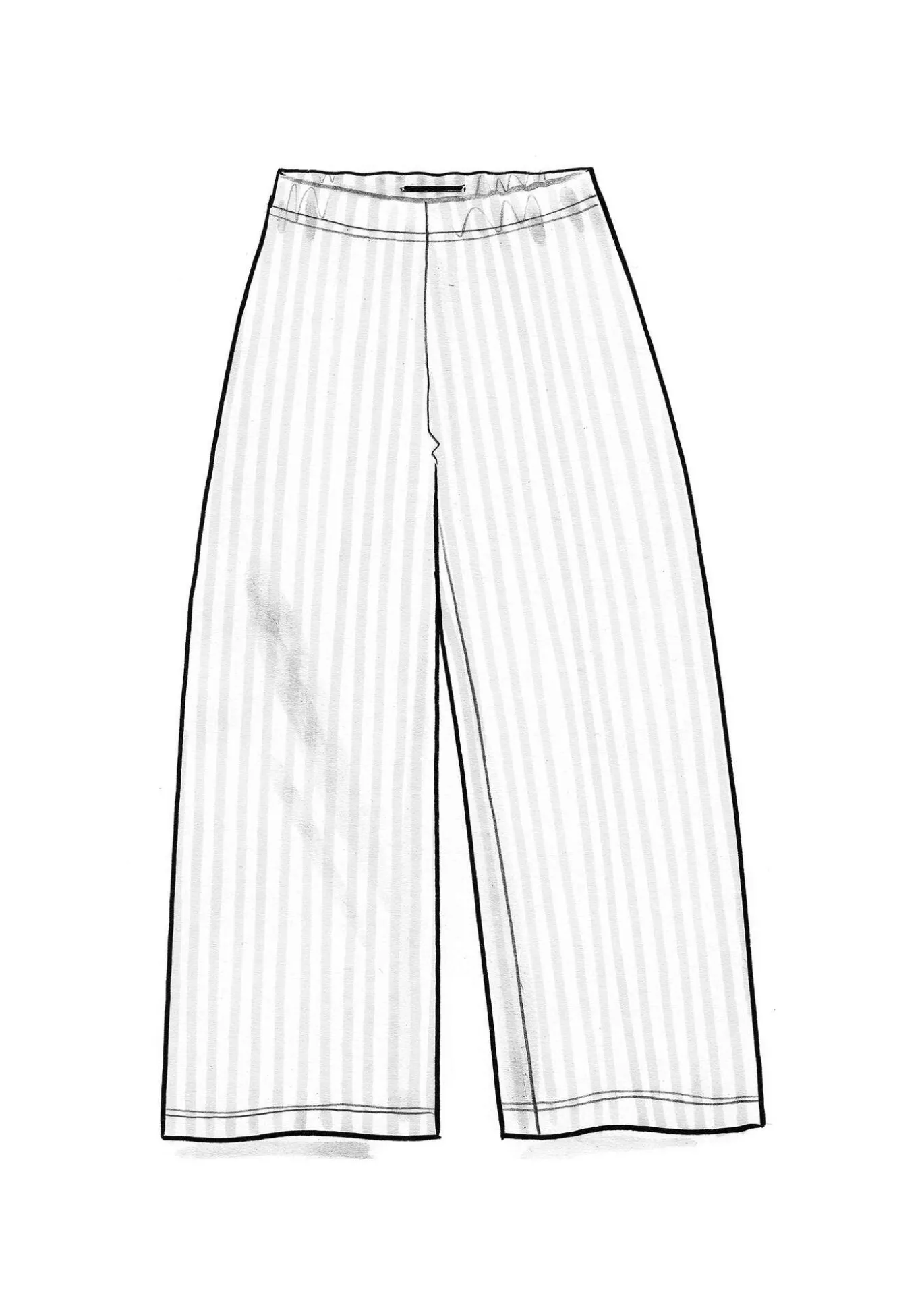 Täyspitkät trikoohousut, joissa on ihanan leveät lahkeet ja vyötäröllä mukava resori. Pystyraidoitus, sillä käänsimme kankaan suunnan.