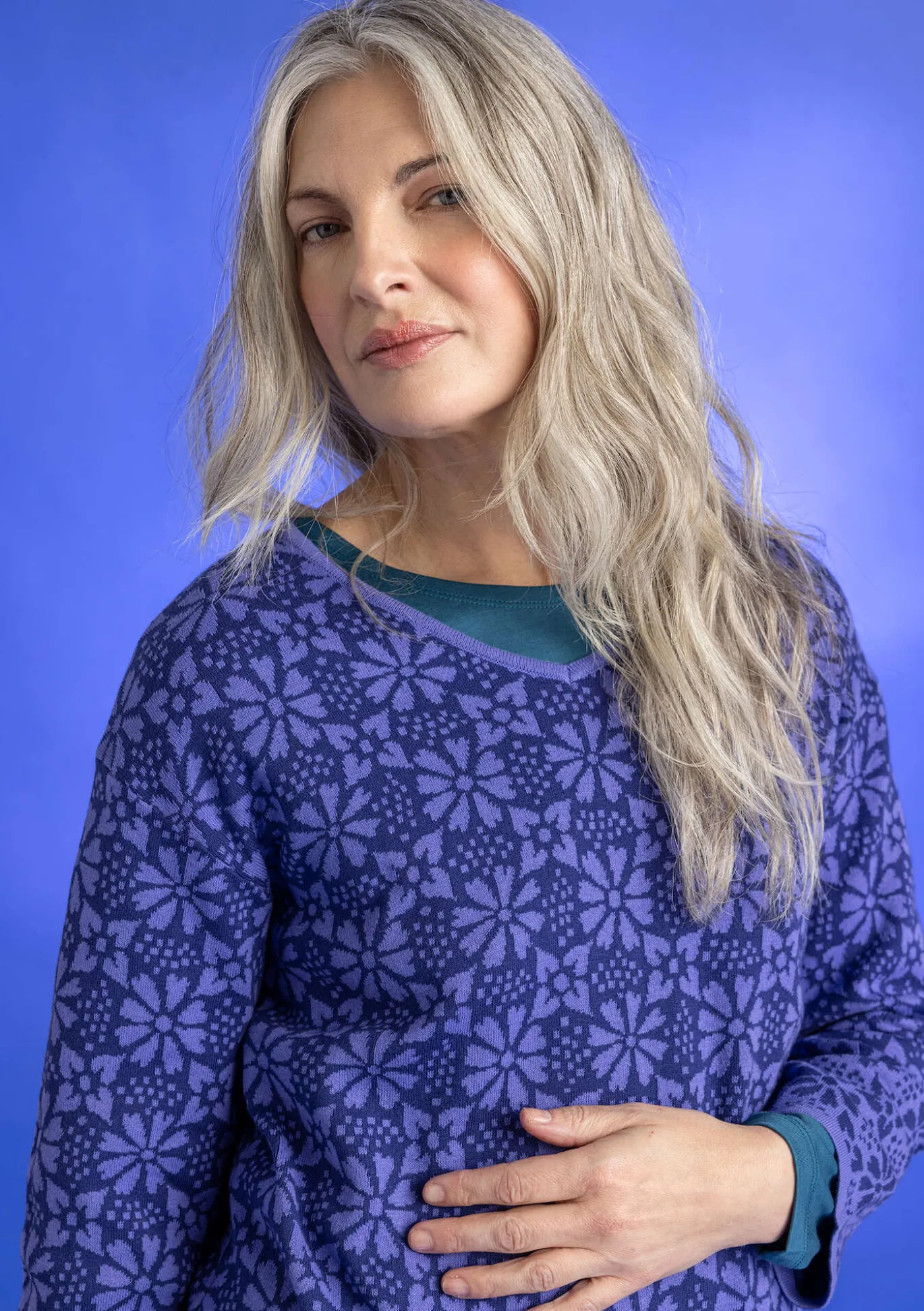 Jacquardneulottu tunika, jossa on hieman tavallista lyhyemmät hihat. V-pääntie sekä edessä että takana. Hihansuissa vaihdoimme värien paikkaa ja saimme vaatteeseen somisteeksi hillityn boordin.