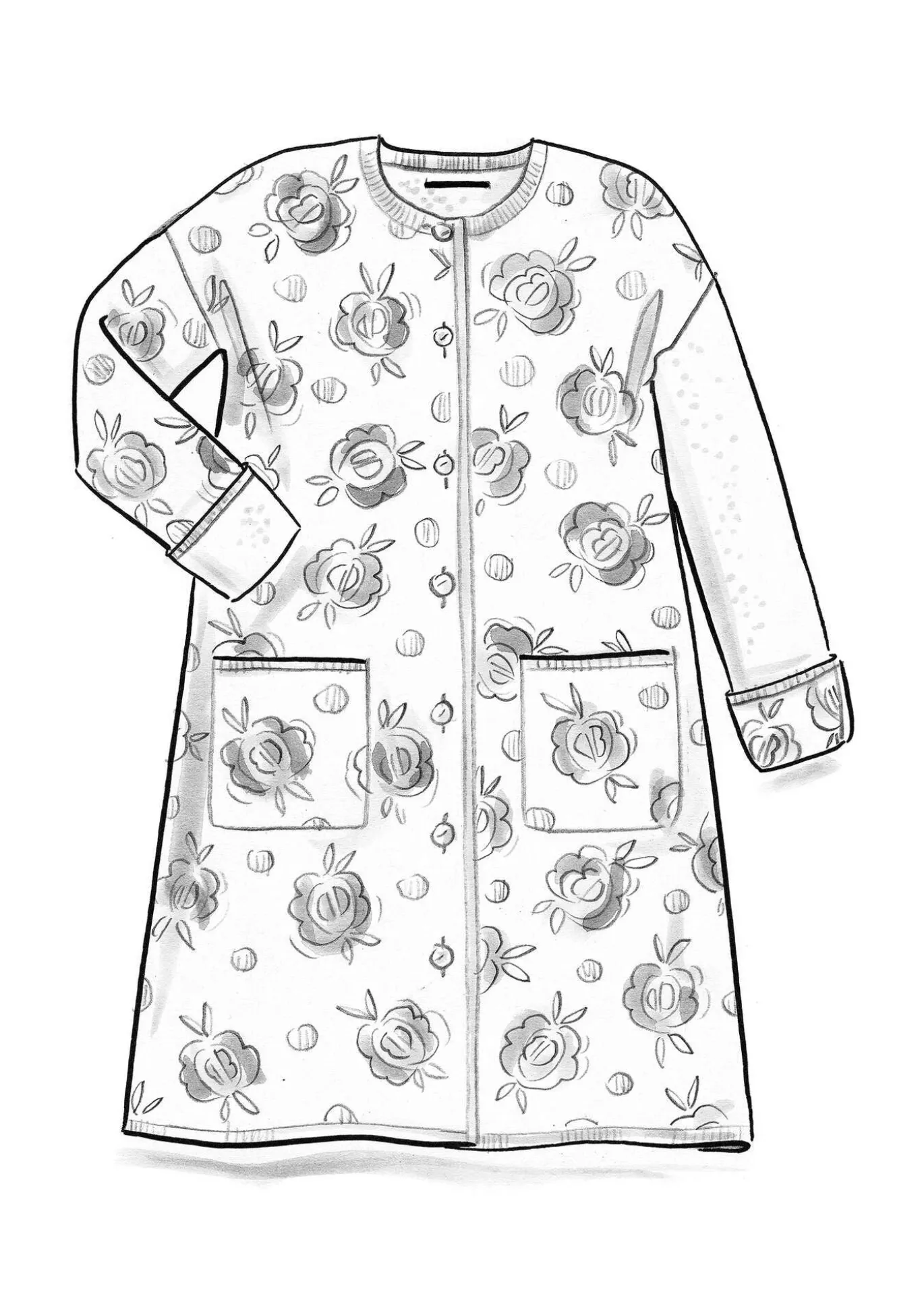 Käännettävä, jacquardneulottu takki huovutettua ekovillaa. Toinen puoli on ruusukuvioitu ja toinen yksivärinen meleerattu. Toisessa hihassa on kääntöpuolen kuosi. Laskettu hartialinja ja pyöreä pääntie. Molemmilla puolilla paikkataskut.
