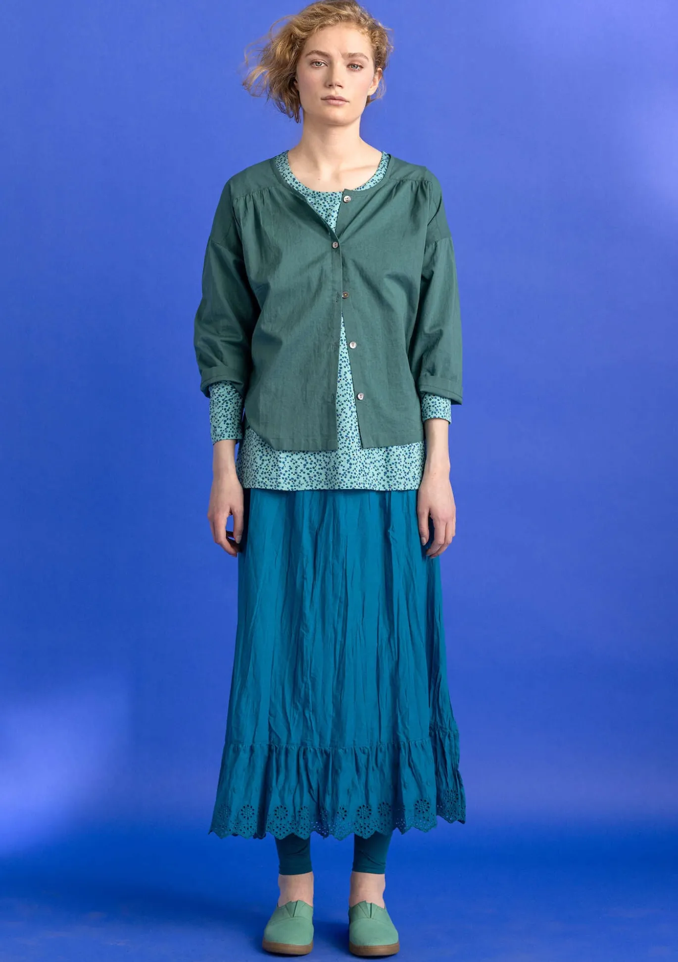 Pelkistetty malli, jossa on vyötäröresori ja kirjailtuja pilkkuja sekä helmassa reikäkirjailuja. Vyötärön resoria voidaan tarvittaessa säätää pienellä napilla.
