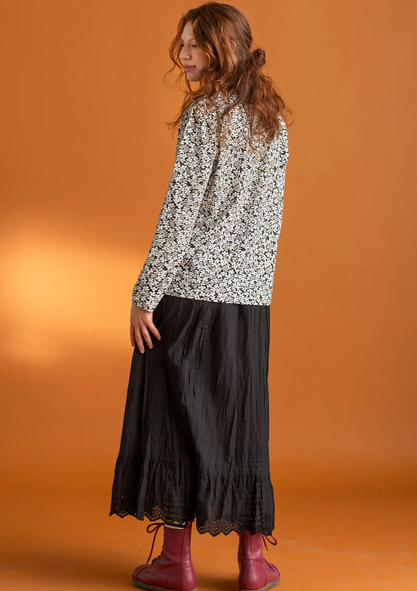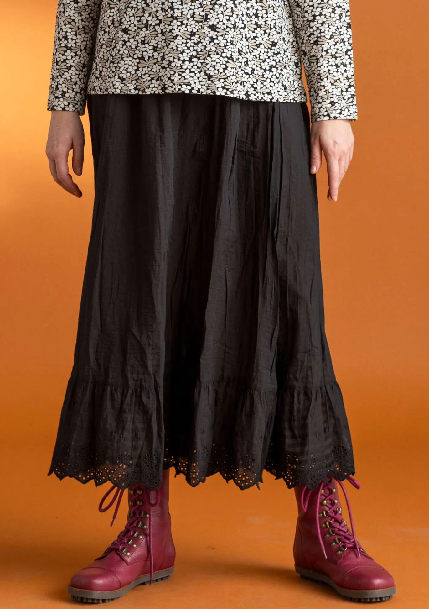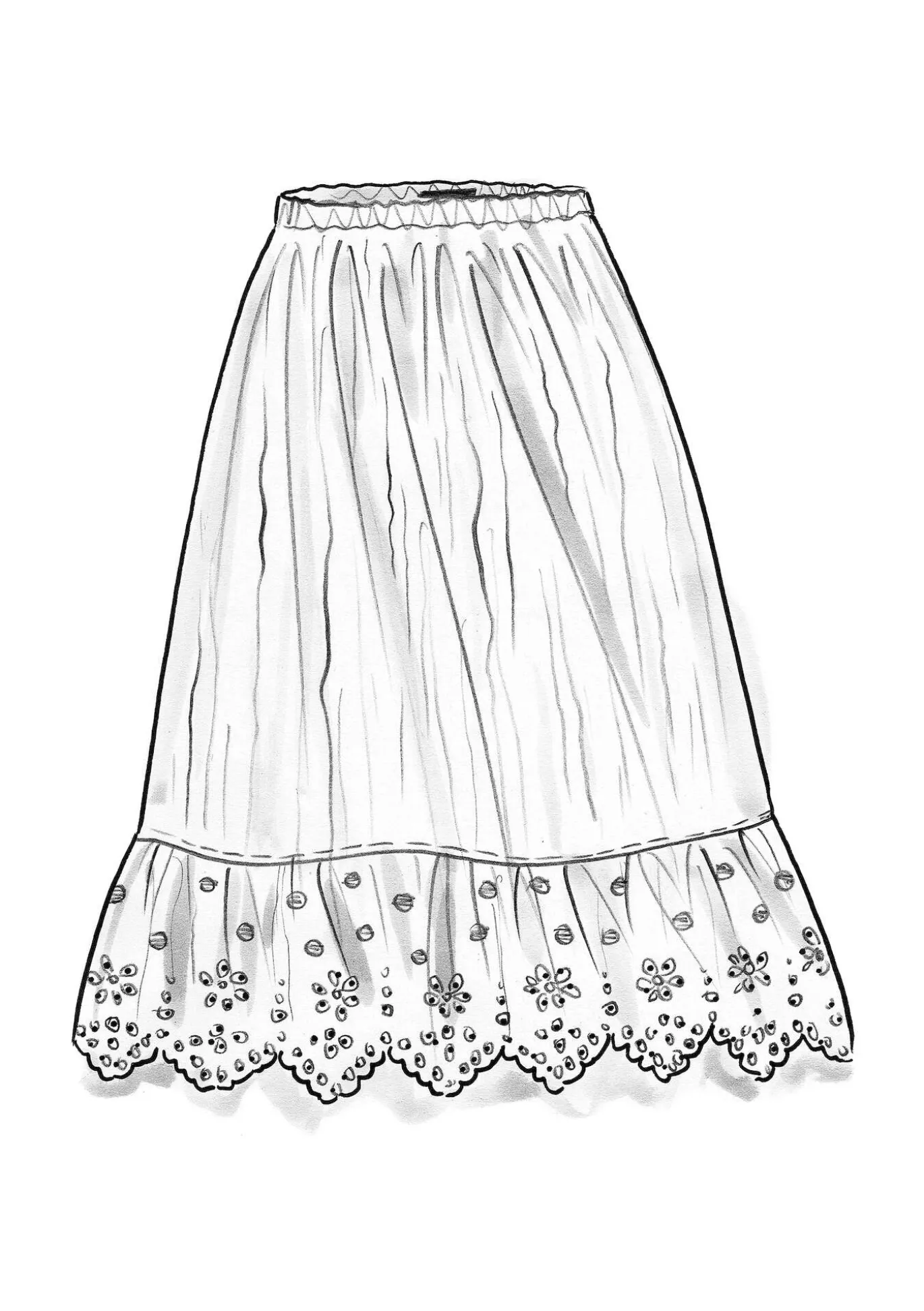 Pelkistetty malli, jossa on vyötäröresori ja kirjailtuja pilkkuja sekä helmassa reikäkirjailuja. Vyötärön resoria voidaan tarvittaessa säätää pienellä napilla.