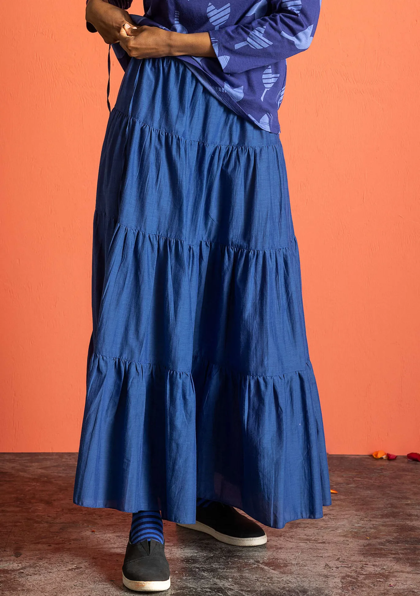 Hame ihanaa puuvilla-silkkisekoitekangasta, joka laskeutuu kauniisti. Erittäin väljä malli. Neljästä kaitaleesta ommeltu upea mekko, jonka vyötäröllä on kiristysnyöri ja mukava resori.
