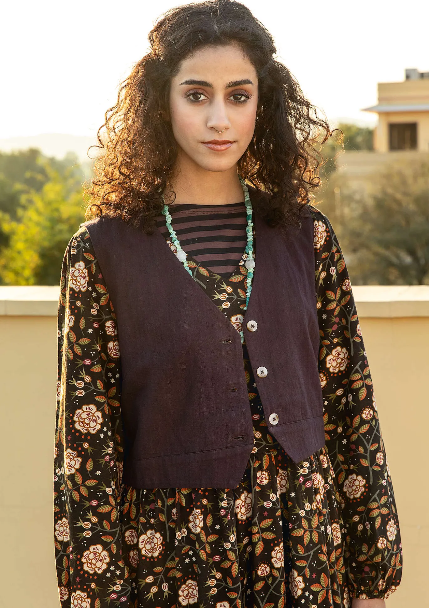 Yksivärinen vuorillinen liivi. Kapeneva alareuna edessä ja pieni v-muotoinen halkio takana. Meleeratut korosteväriset napit.