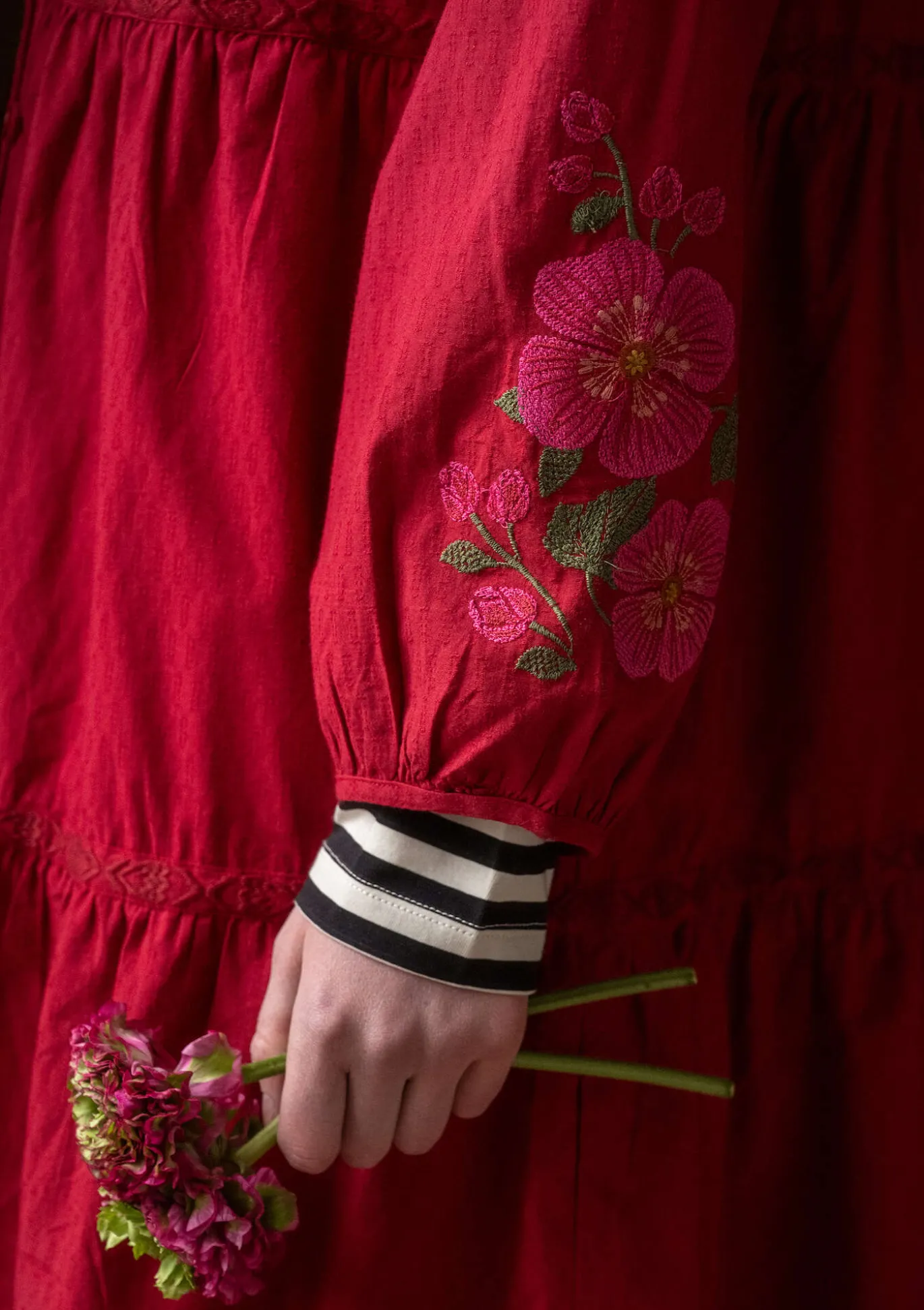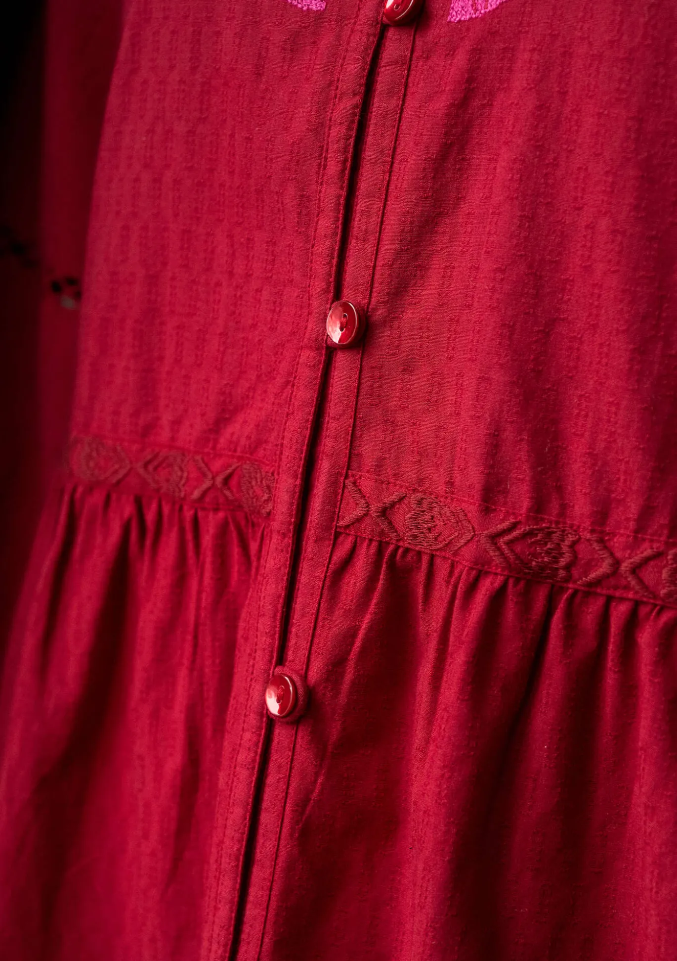 Dobby-kudottu mekko tukevahkoa kangasta. Kaitaleista ommeltu alas asti napitettava malli, jonka hameosassa on boordit edessä ja takana. Täyspitkät pussihihat, joissa on pitsinauhat ja kirjailut. Lisäksi runsaasti kirjailtu miehusta. Pyöreä pääntie, jossa on lyhyt vekitetty pystykaulus, sekä helmiäisnapit sävy sävyyn.