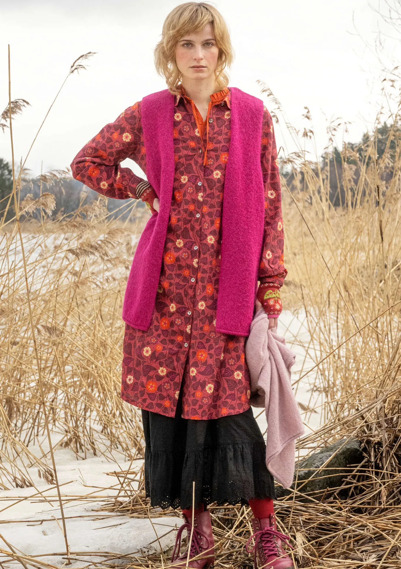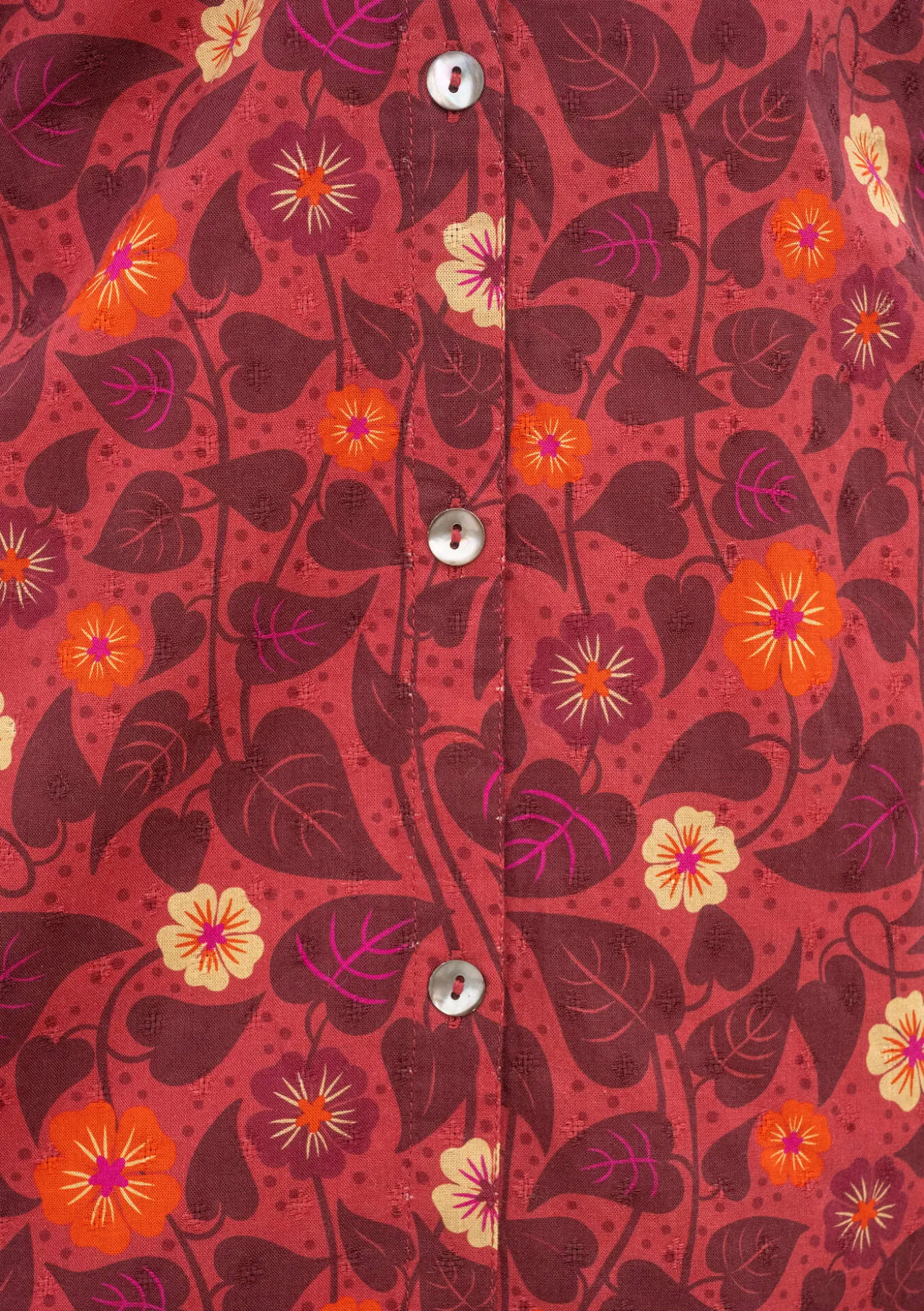 Digipainettu paitamekko kevyesti struktuuripintaista dobby-kudosta. Alas asti napitettavassa mekossa on pieni paitakaulus. Vyötäröllä leikkaus, ja sekä takana että etukappaleiden sivuissa rypytys. Helmiäisnapit edessä ja pieni nappi myös hihansuissa.