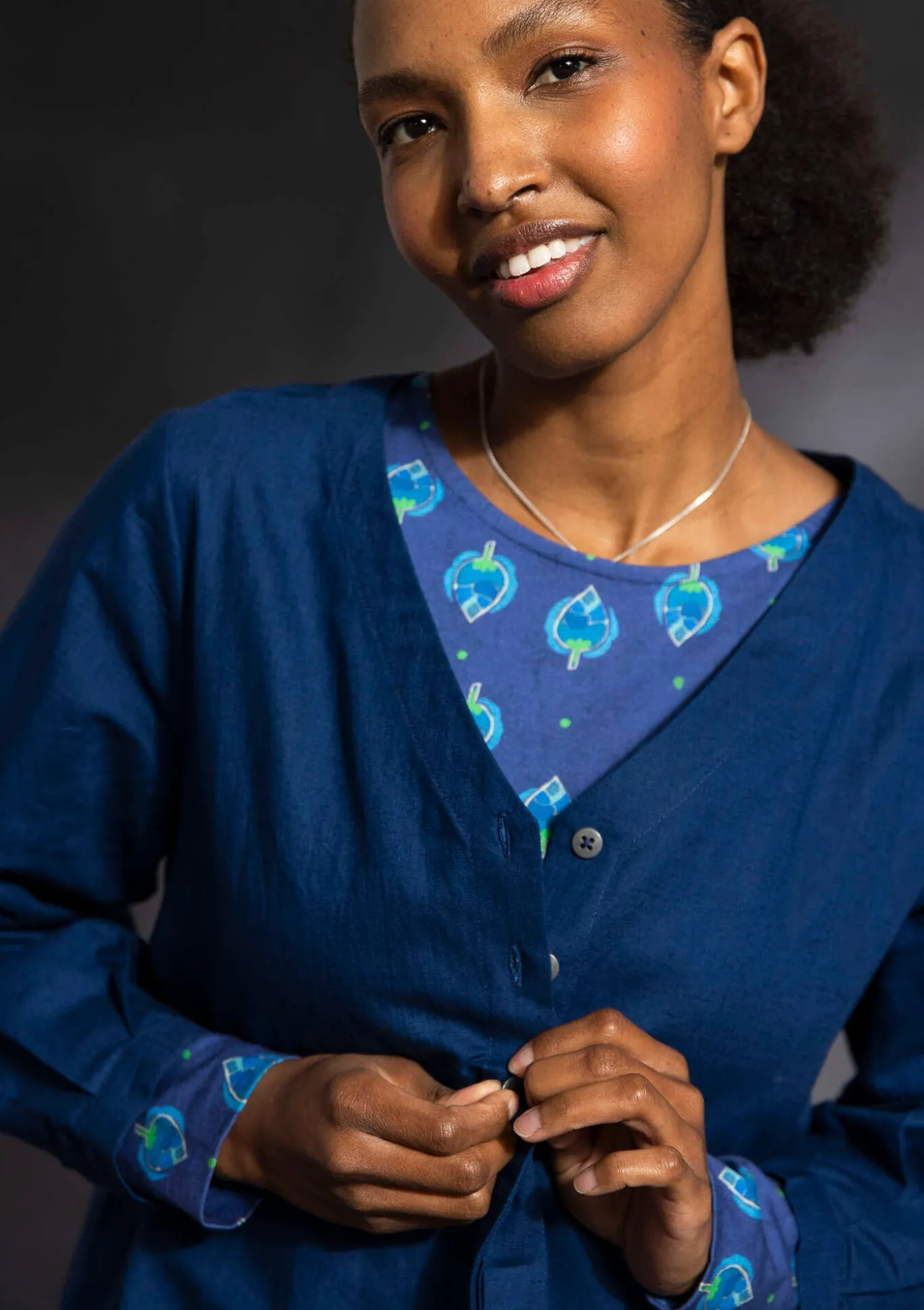 Monikäyttöinen mekko, jossa on V-pääntie. Alas asti napitettava malli, jossa metallinapit ovat näkyvissä vain nappilistan yläosassa ja muualla ne jäävät nappilistan alle. Täyspitkät kevyesti pussille menevät hihat. Sivuhalkiot ja sivutaskut. Ommeltu jäännöskankaista.