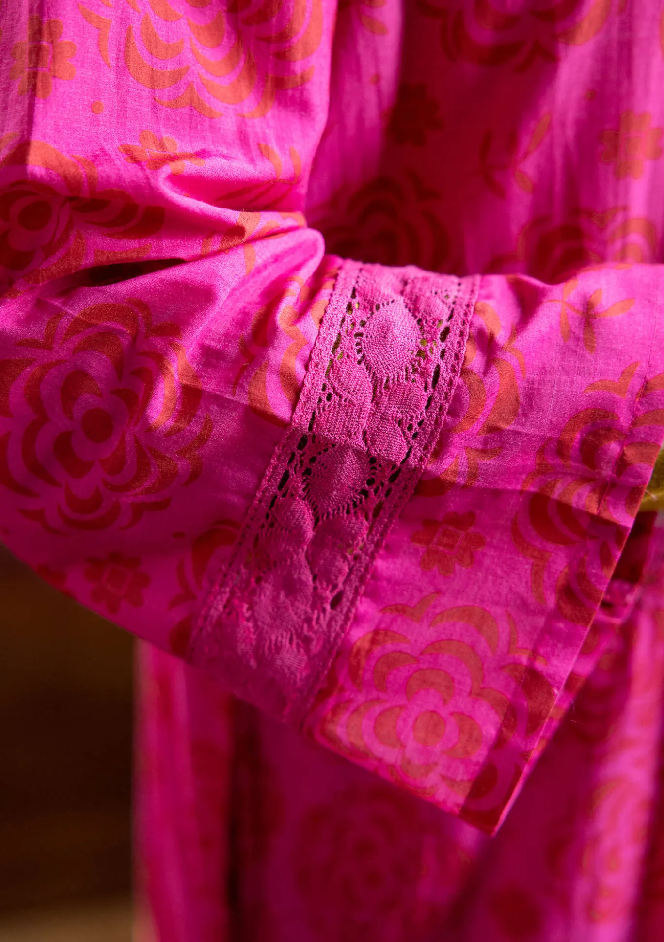 Digipainettu pitkä mekko, joka on ommeltu kaitaleista ja jossa on rypytys. Kirjailu miehustassa ja kaitaleissa. Nelikulmainen pääntie, 3/4-hihat, hieman levenevä helma ja hihoissa upotettua pitsiä. Sivutaskut sekä vyötärösaumassa upotettu tasku ja koristeelliset kirjailut.