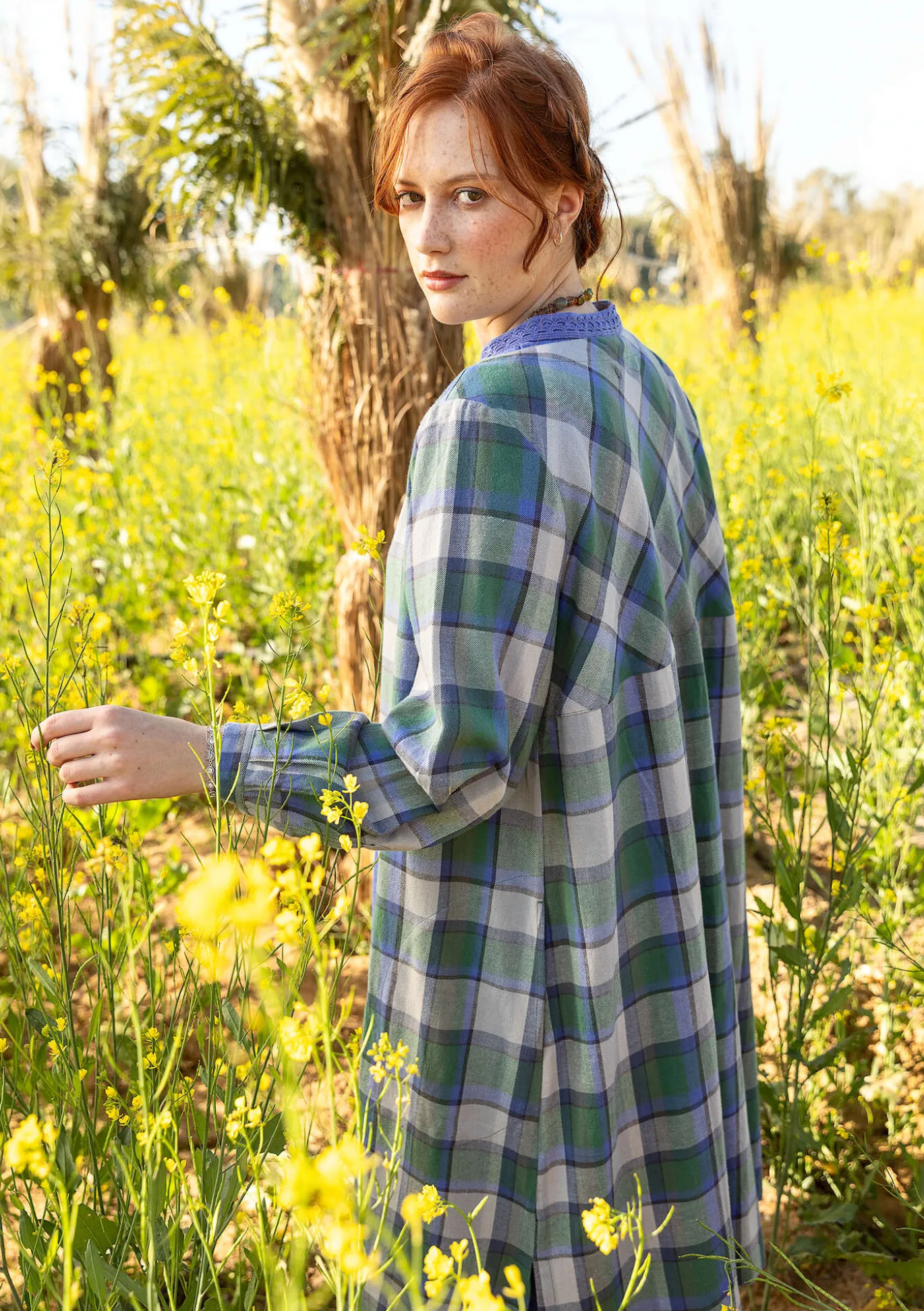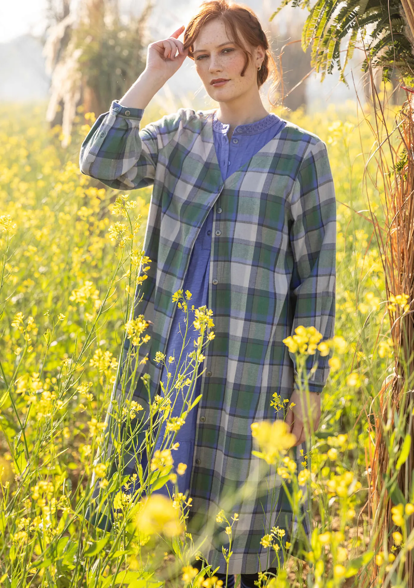 Monikäyttöisessä v-aukkoisessa mekossa on rentoa ilmettä ja materiaali ruutukuosista flanellia. Alas asti napitettava malli, jossa metallinapit ovat näkyvissä vain nappilistan yläosassa ja muualla ne jäävät nappilistan alle. Täyspitkät kevyesti pussille menevät hihat. Sivuhalkiot ja sivutaskut.