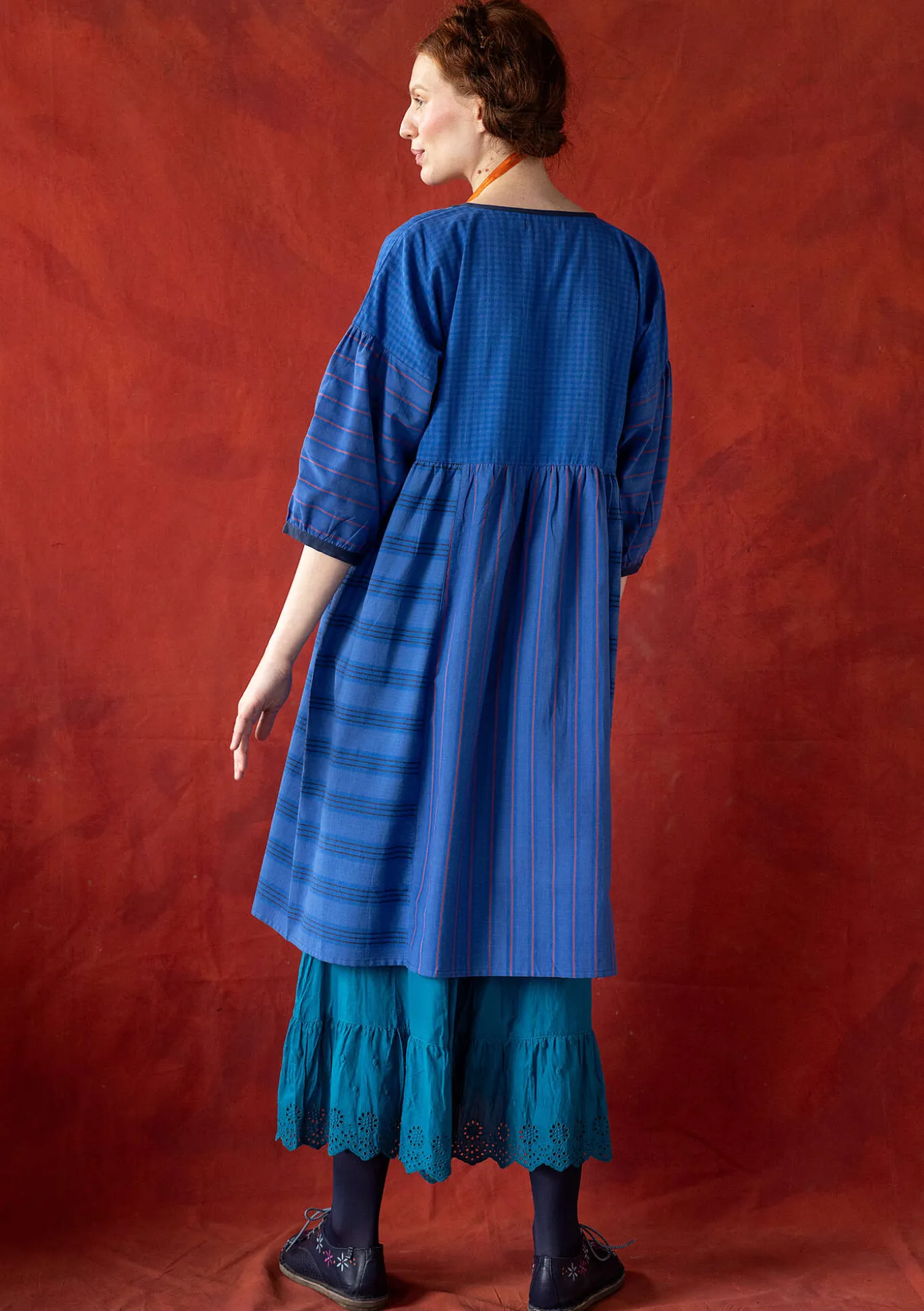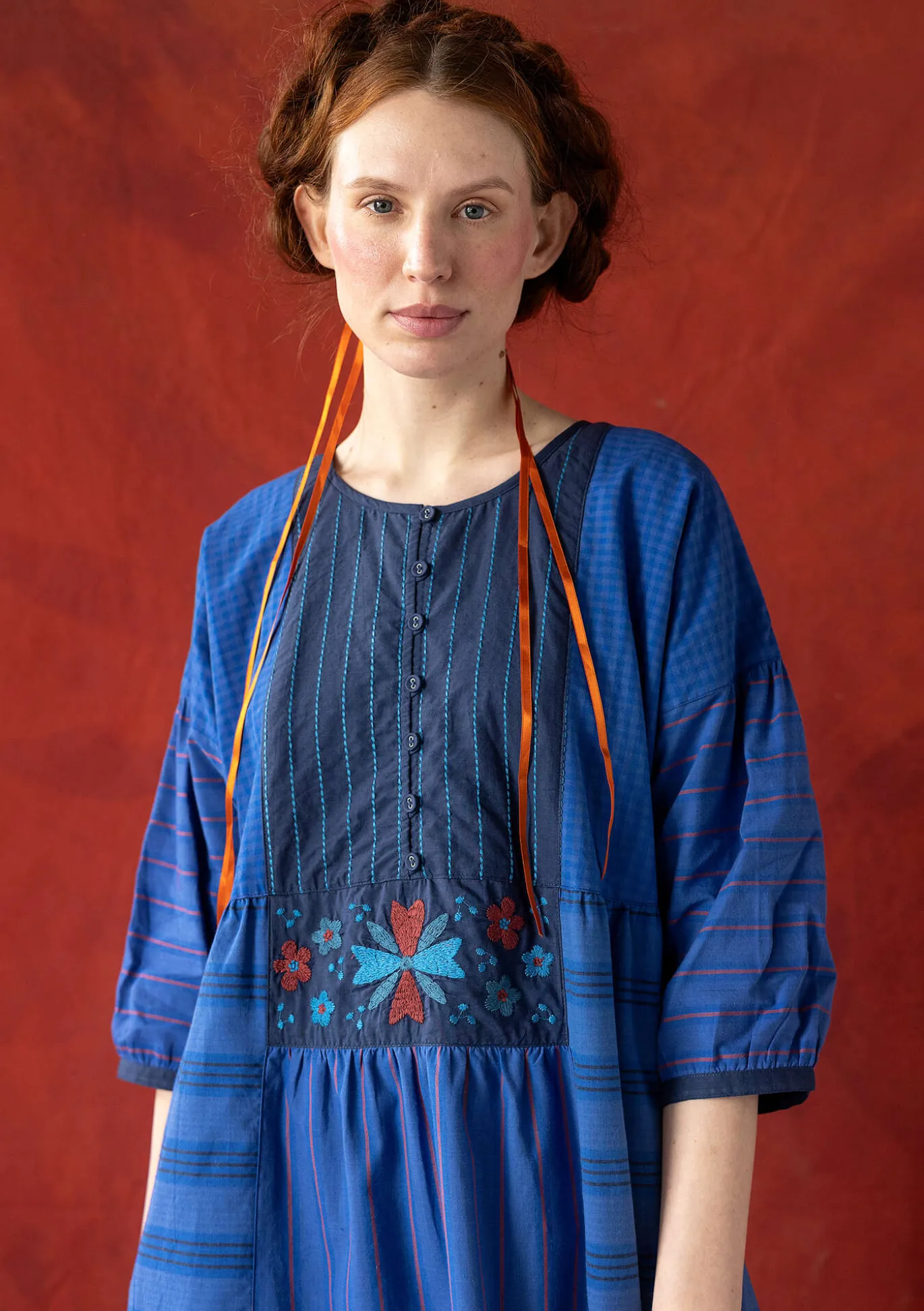 Mekko, jossa on kudottuja raitoja ja lankavärjättyjä ruutuja. Kirjailtu kaarroke ja vyötäröllä leikkaus ja rypytys. Pyöreä pääntie, kyynärpääpituiset hihat ja lasketut olkasaumat. Miehustassa kangaspäällysteiset napit.
