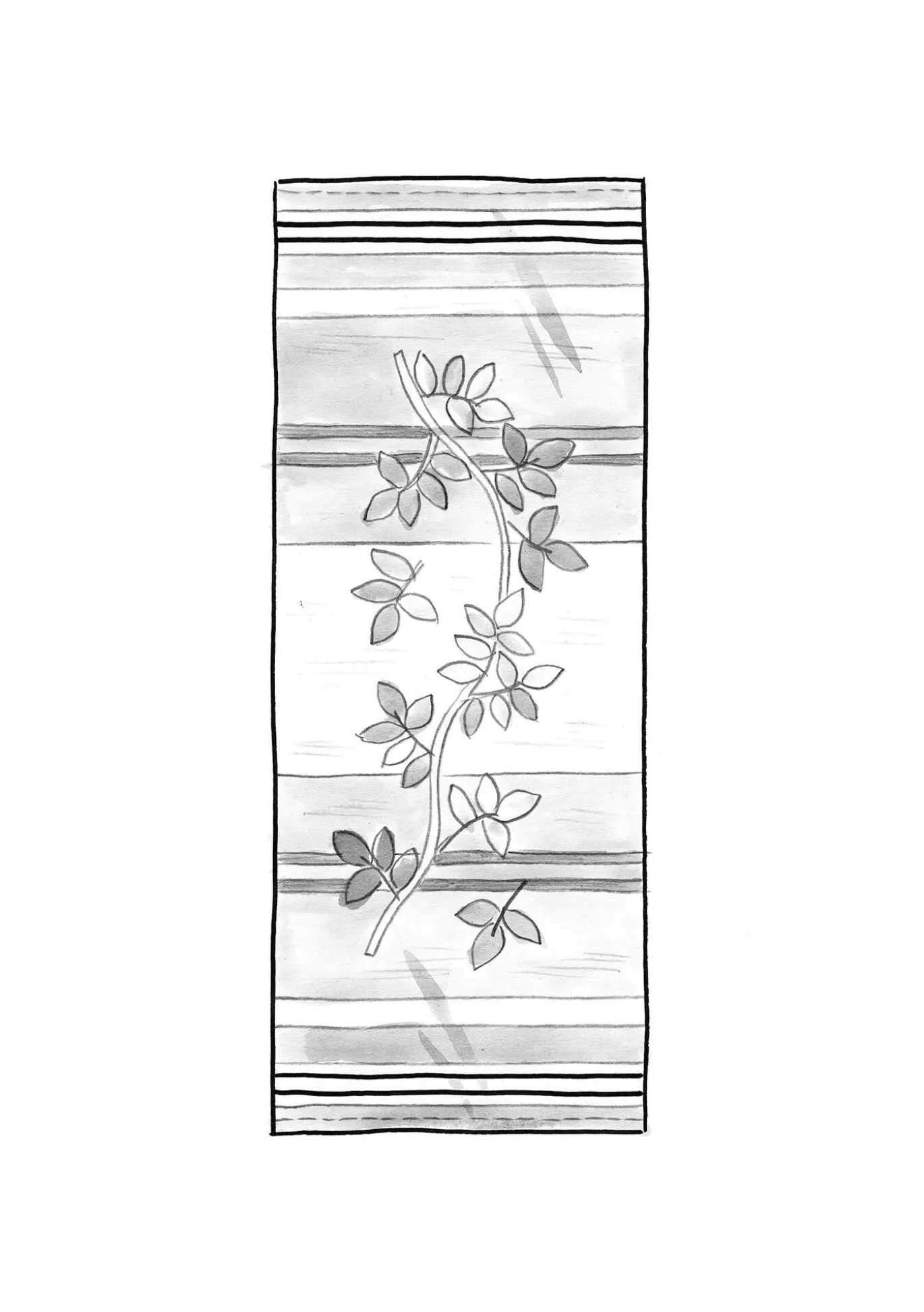 Kudottu matto, jossa on lankavärjätyt raidat. Kestävää ekopuuvillaa. Maton keskiosaa koristavat kirjaillut lehdet.