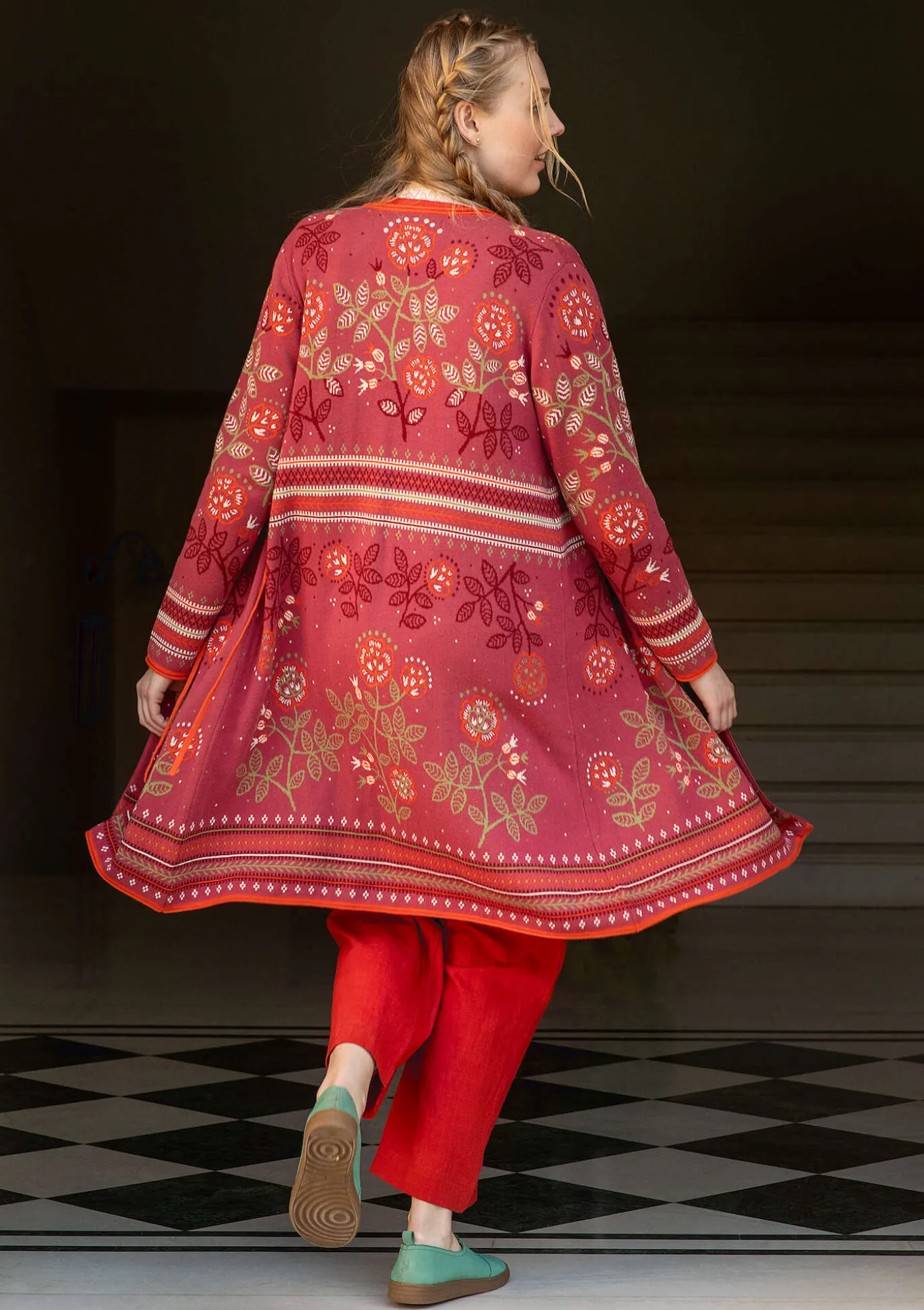 Kietaisumallisessa jacquardneuletakissa kuviokuosin aiheena ovat kauniit ruusut ja boordit. Neulotut solmintanauhat, täyspitkät hihat ja viimeistelty kiertyvillä reunuksilla.
