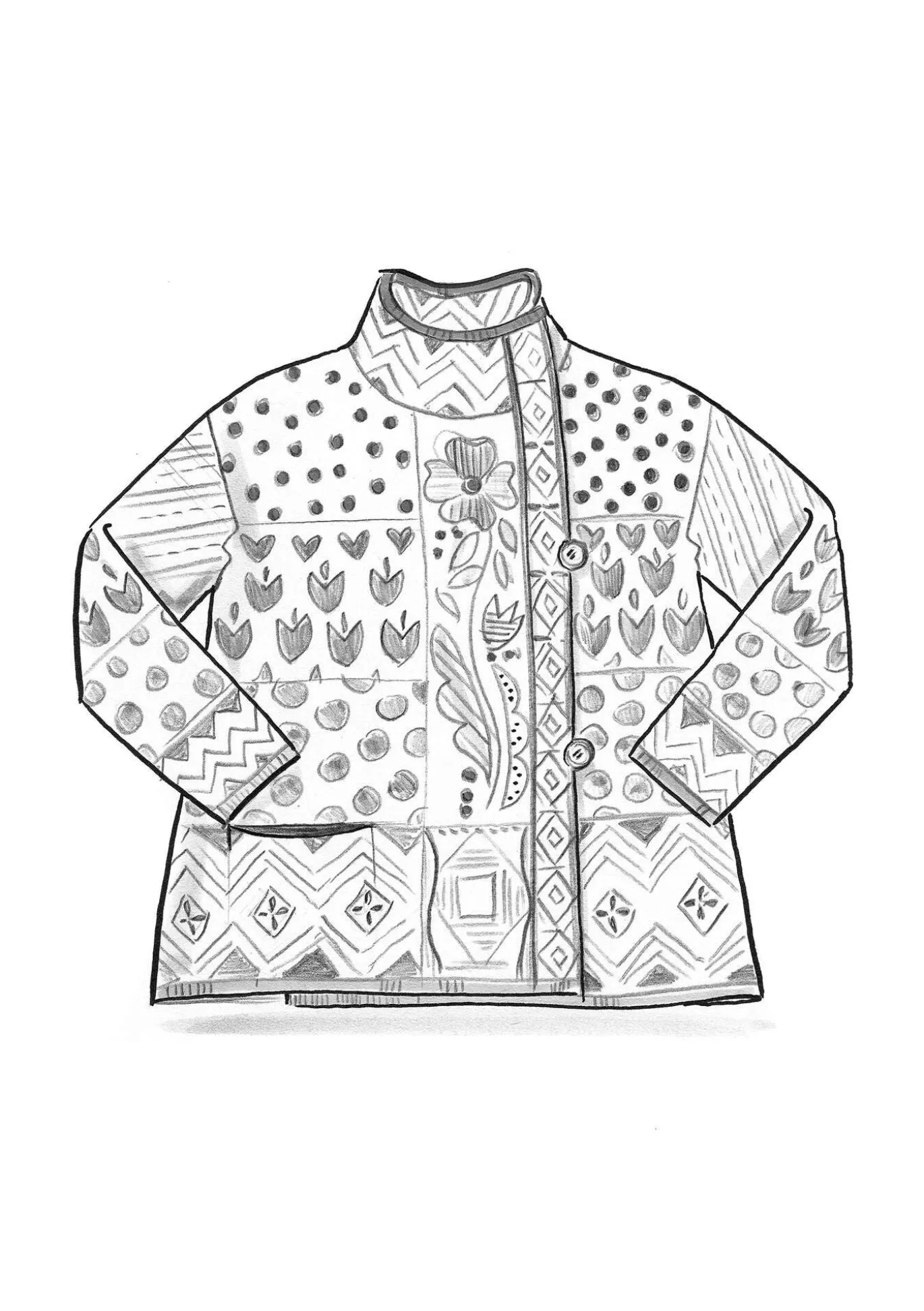 Lyhyehkön mallinen jacquardneulottu kietaisuneuletakki, jossa on kaksi puunappia. Kauniisti kuvioitu malli, jossa on 3/4-hihat ja korkeahko kaulus. Upotettu tasku ja molemmissa sivuissa kauniisti käsin kirjailtu kukka.