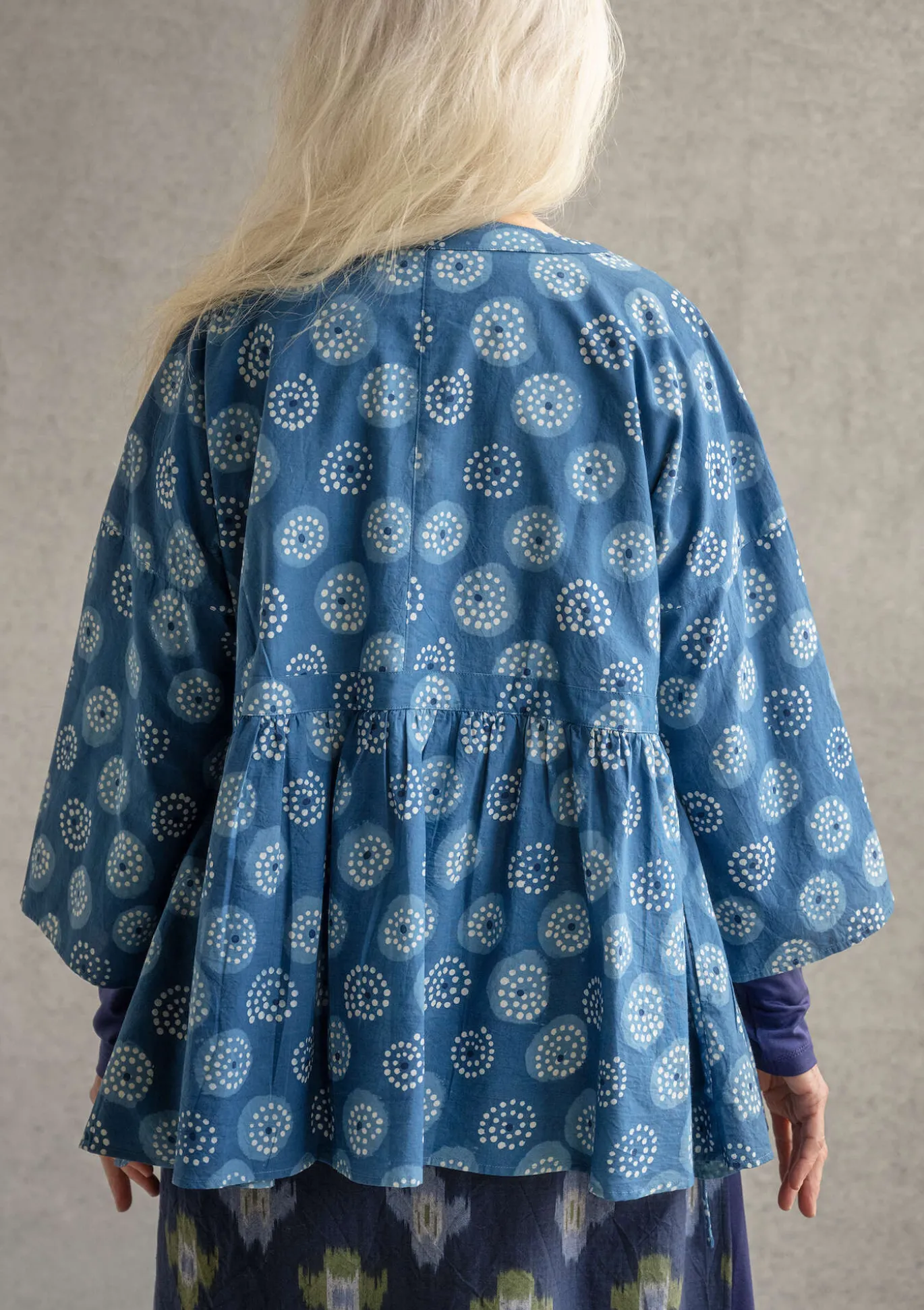 Kietaisupusero, jossa on 3/4-hihat, lasketut olkasaumat, nyörit sivussa ja sivutaskut. Tämä pusero edustaa käsityötaitoa hienoimmillaan: se on laattapainettu savella ja värjätty useilla kasvipigmenteillä. Huolellisesti viimeistelty: nyörin päihin on kierretty lankaa hienoksi yksityiskohdaksi.