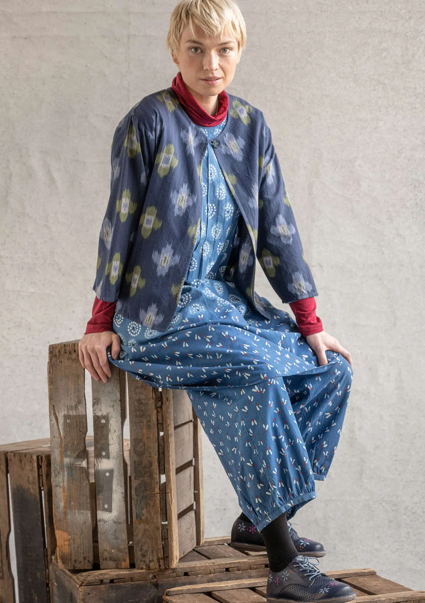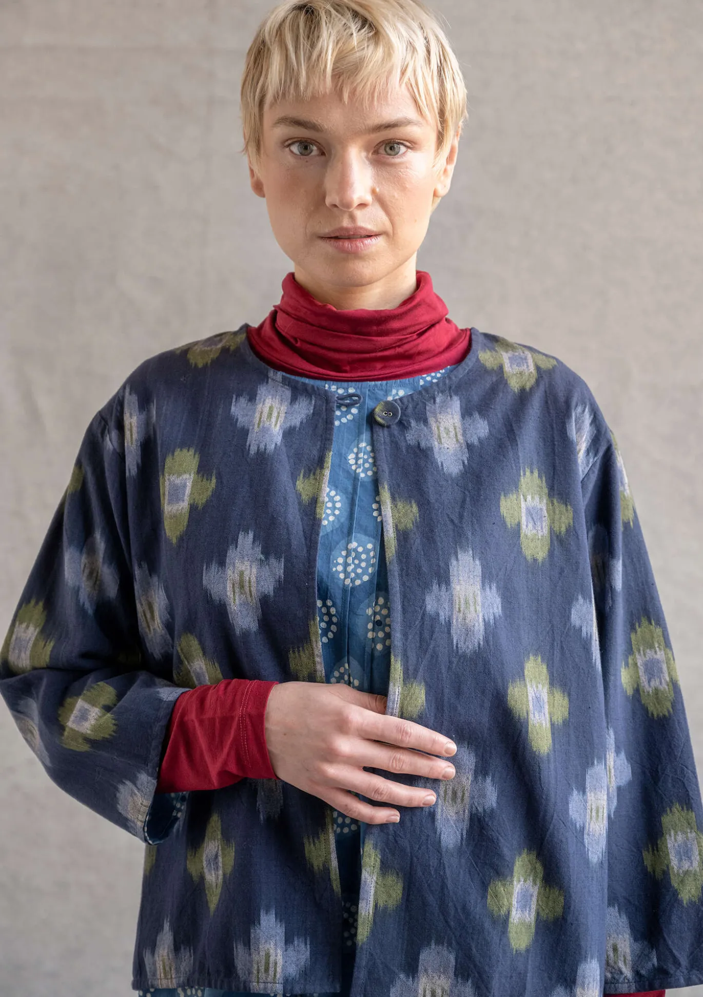 Ikat-kudottu takki, jossa on kukkakuvio. Hieman levenevä helma, pyöreä pääntie ja 3/4-hihat. Yksi pelkistetty tekstiilipäällysteinen nappi.