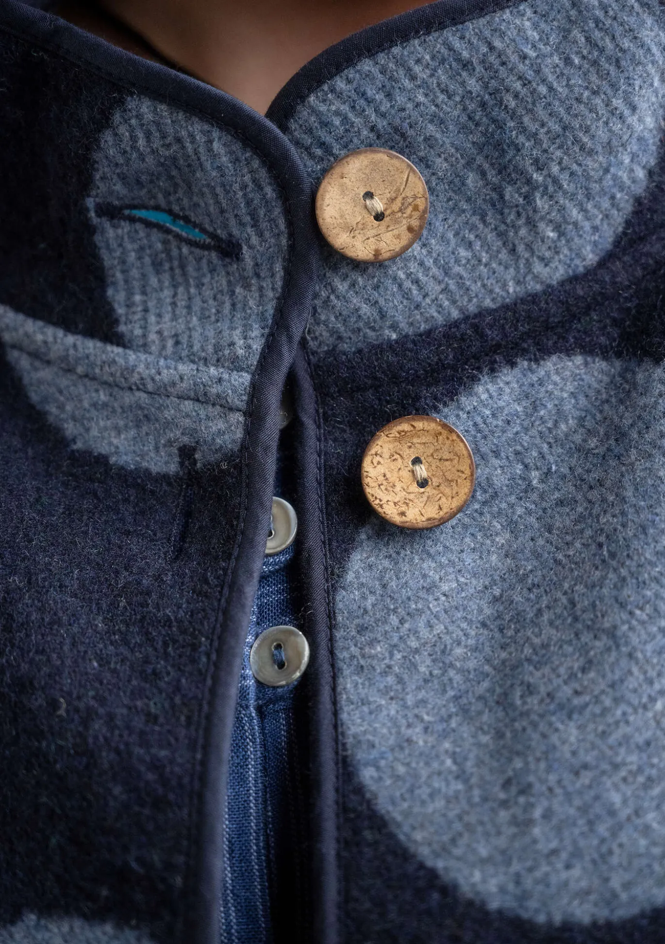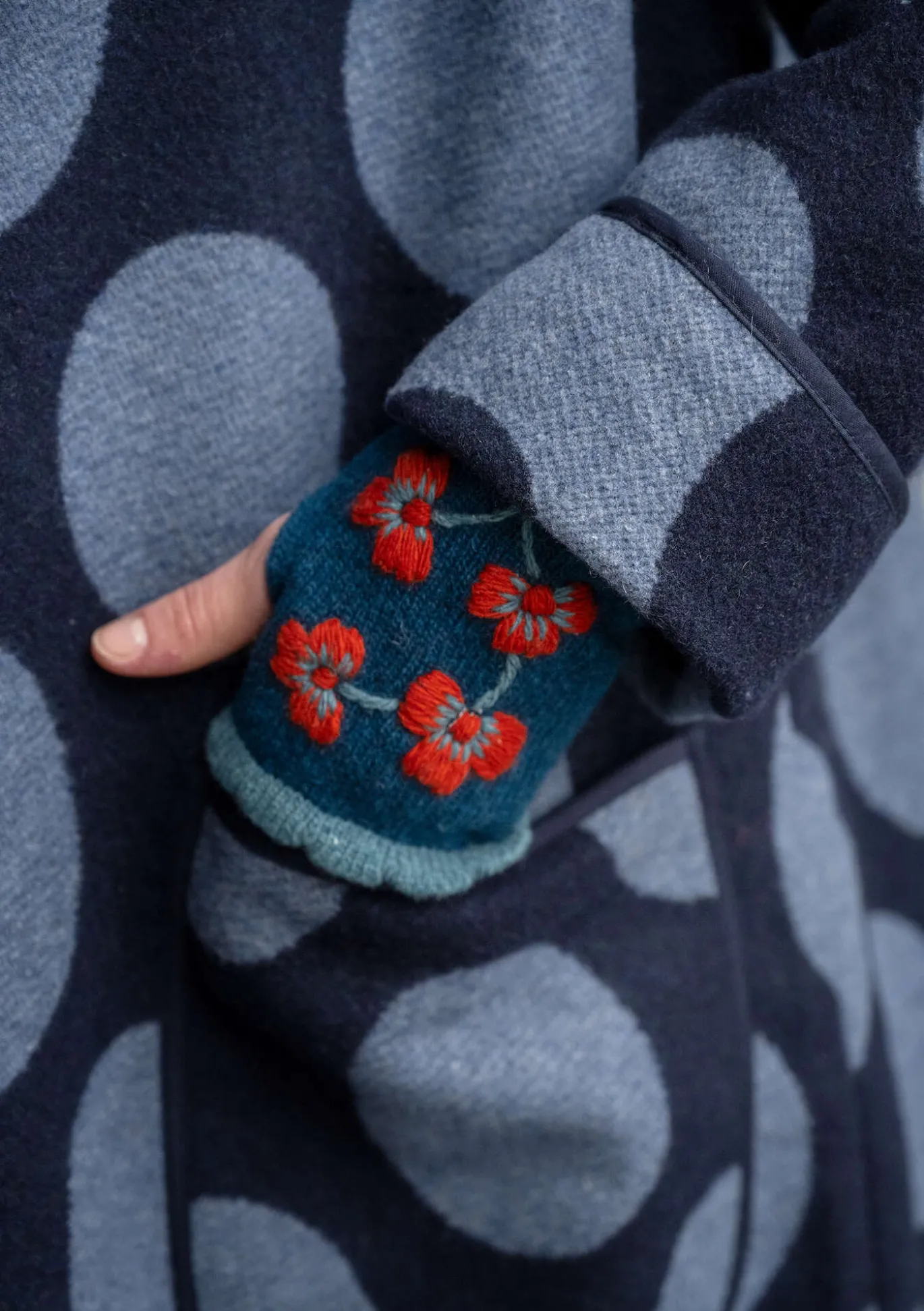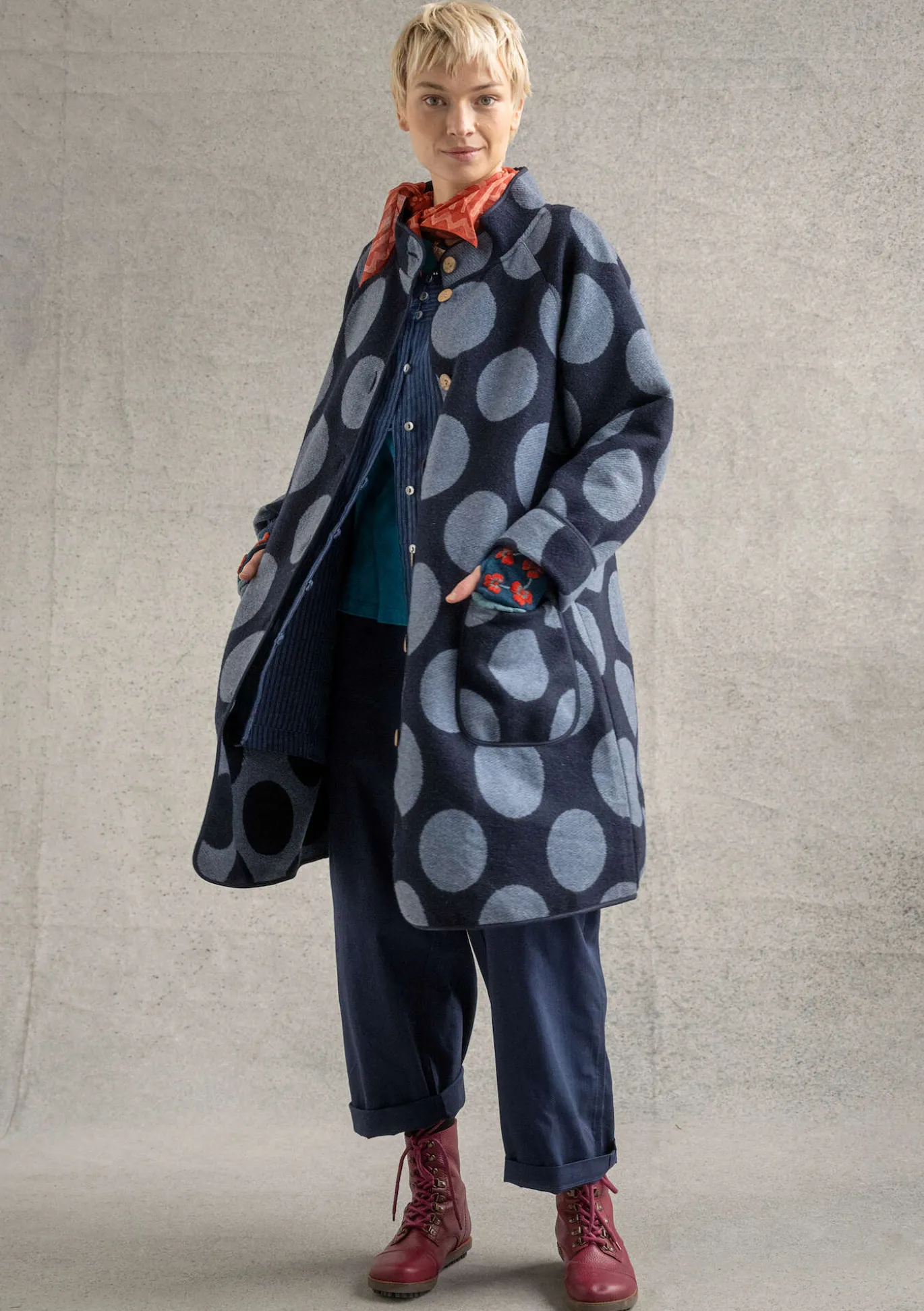 Jacquardkudottu takki, jossa on upea iso pilkkukuvio. Nauhakantattu malli, jossa on täyspitkät raglanhihat, korkea kaulus ja paikkataskut. Napit luonnonväristä kookosta.