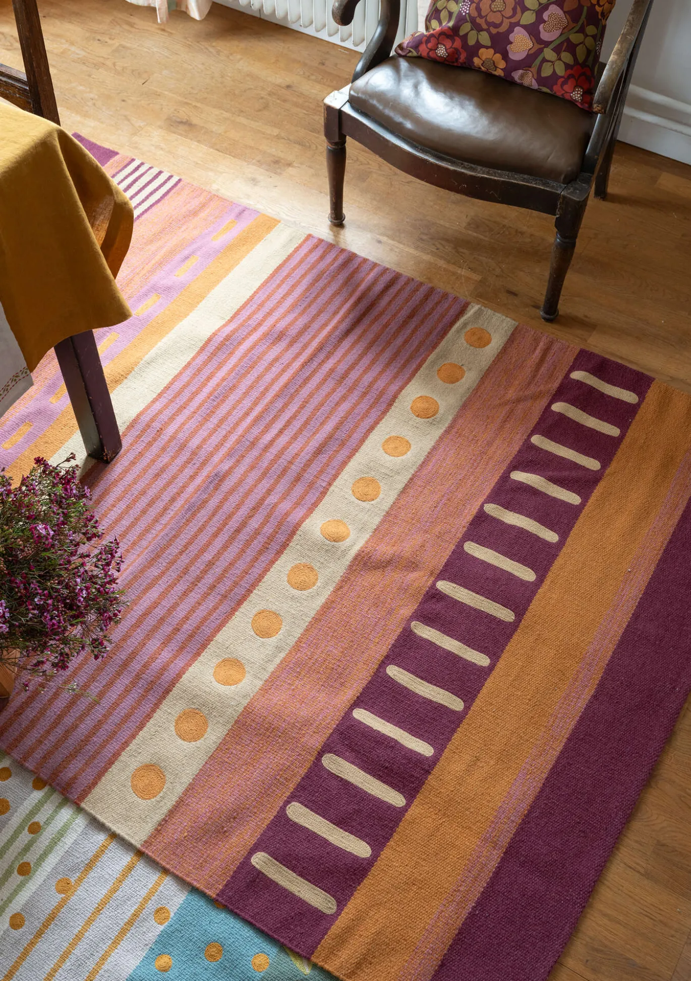 Isohko raidallinen villamatto piristää tilaa kuin tilaa. Siinä on ihastuttavat värit ja epäsäännöllinen raitakuvio. Kestävää villaa, jossa on pirteät kirjailut.