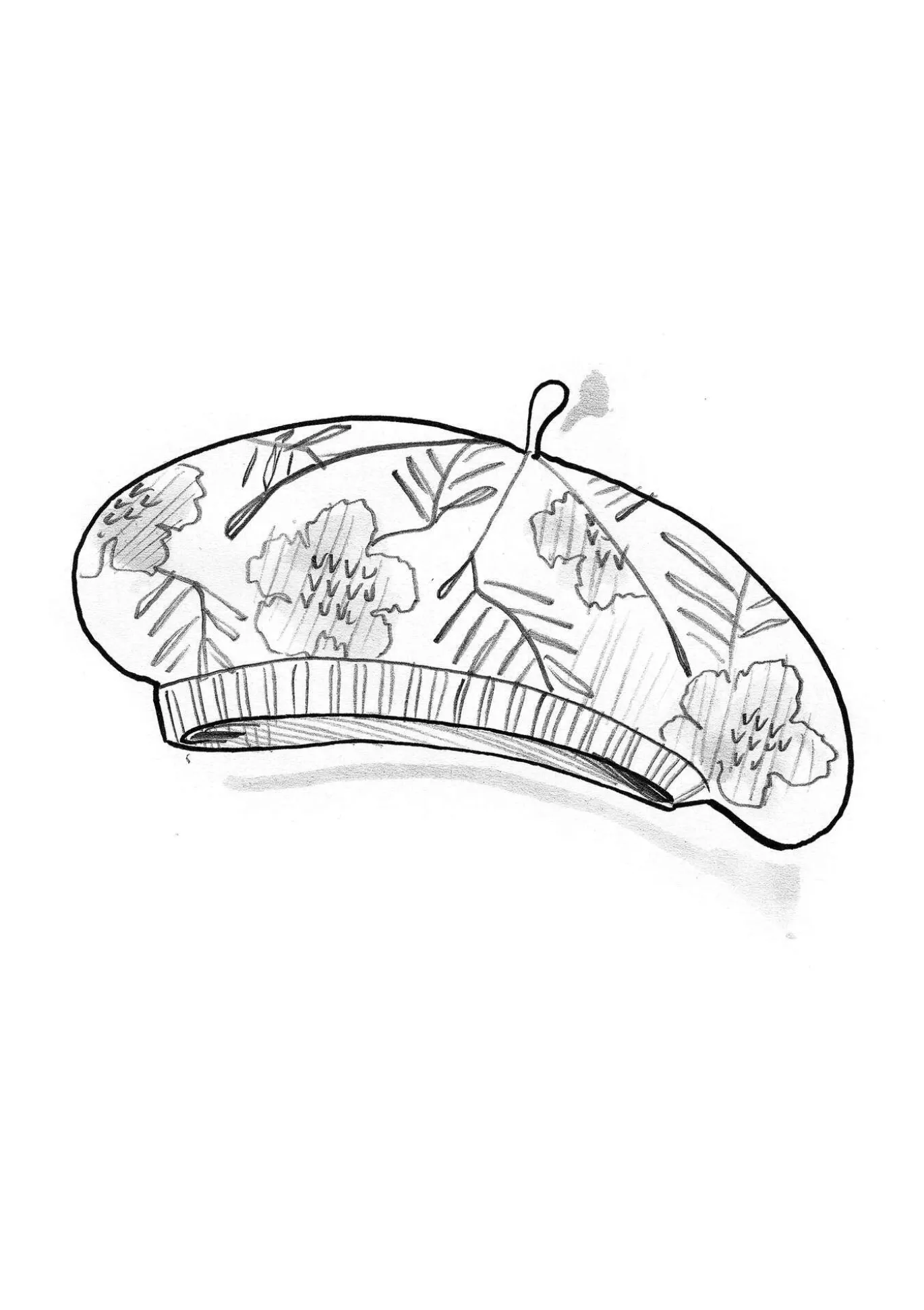 Jacquardneulottu baskeri, jonka pohjalanka on alpakkasekoitetta ja kuviolanka puuvillaa. Alareunassa näkyvä ribbineulos.