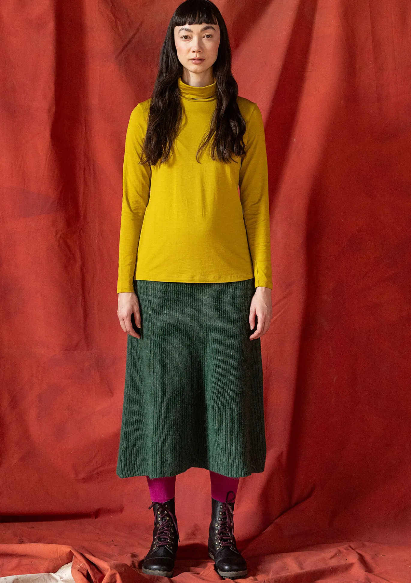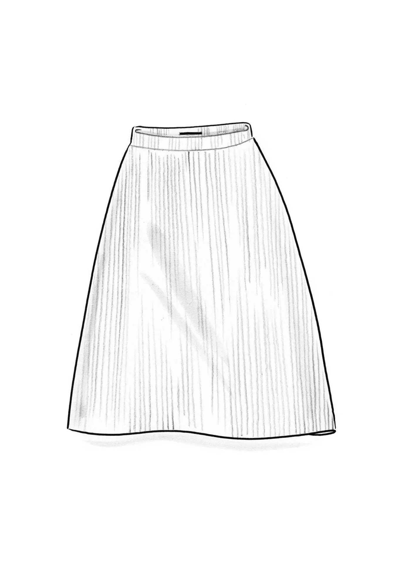 Pitkähkö, helmasta hieman levenevä patenttineuloshame. Vyötäröllä ribbineulosta ja päällystetty resori.