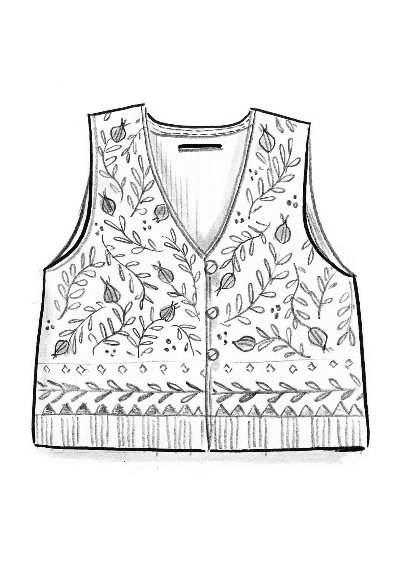 Alas asti napitettavassa jacquardneuleliivissä on V-pääntie ja helmiäisnapit. Kuviokuosissa lehtiköynnöksiä ja kuvioituja boordeja, helmassa ribbireunus.