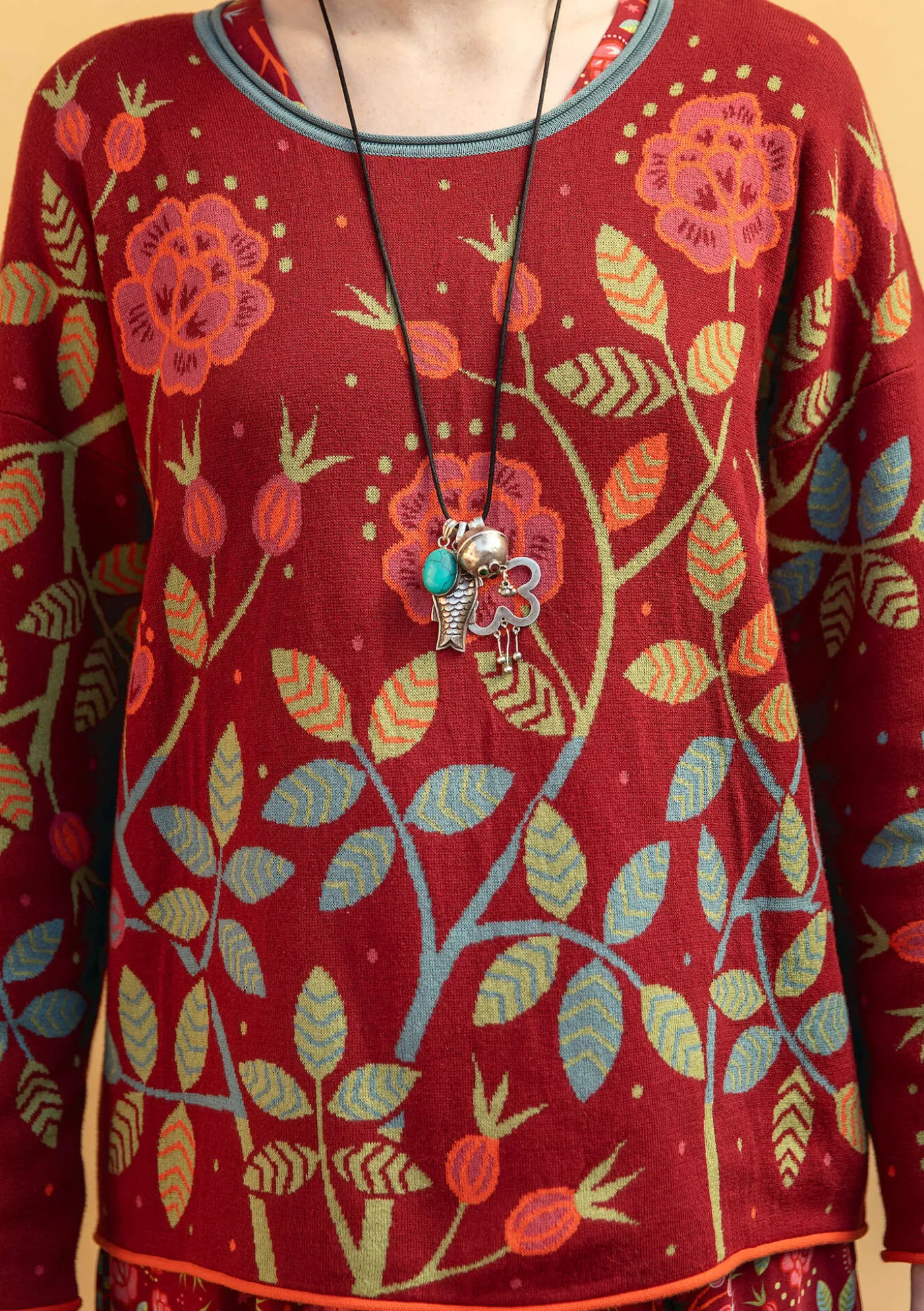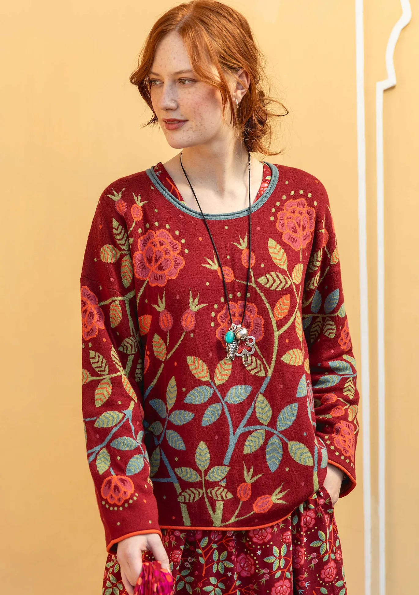Jacquardneulepuseron kuviokuosin aiheena on orjanruusu kiemurtelevine oksineen. Suora malli, pyöreä pääntie ja täyspitkät hihat, jotka on viimeistelty kauniilla kiertyvillä reunoilla.