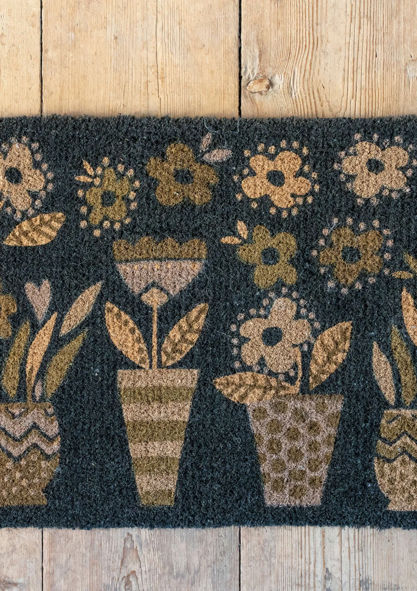 Kookoskuituinen ovimatto, jossa on silkkipainettu kuvio leikkisiä kukkia ja ruukkuja.