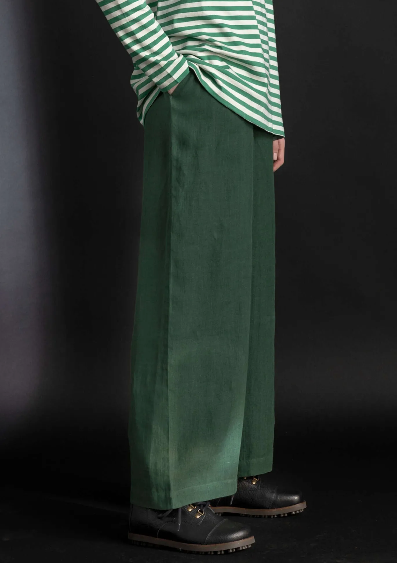 Materiaali on kauniisti laskeutuvaa pellavakangasta. Valittavana on yksivärisiä sekä lankavärjätty raitakuosi. Täyspitkät lahkeet ja vyötäröllä yksinkertainen resori. Suorat, väljät lahkeet ja sivuissa käytännölliset taskut.