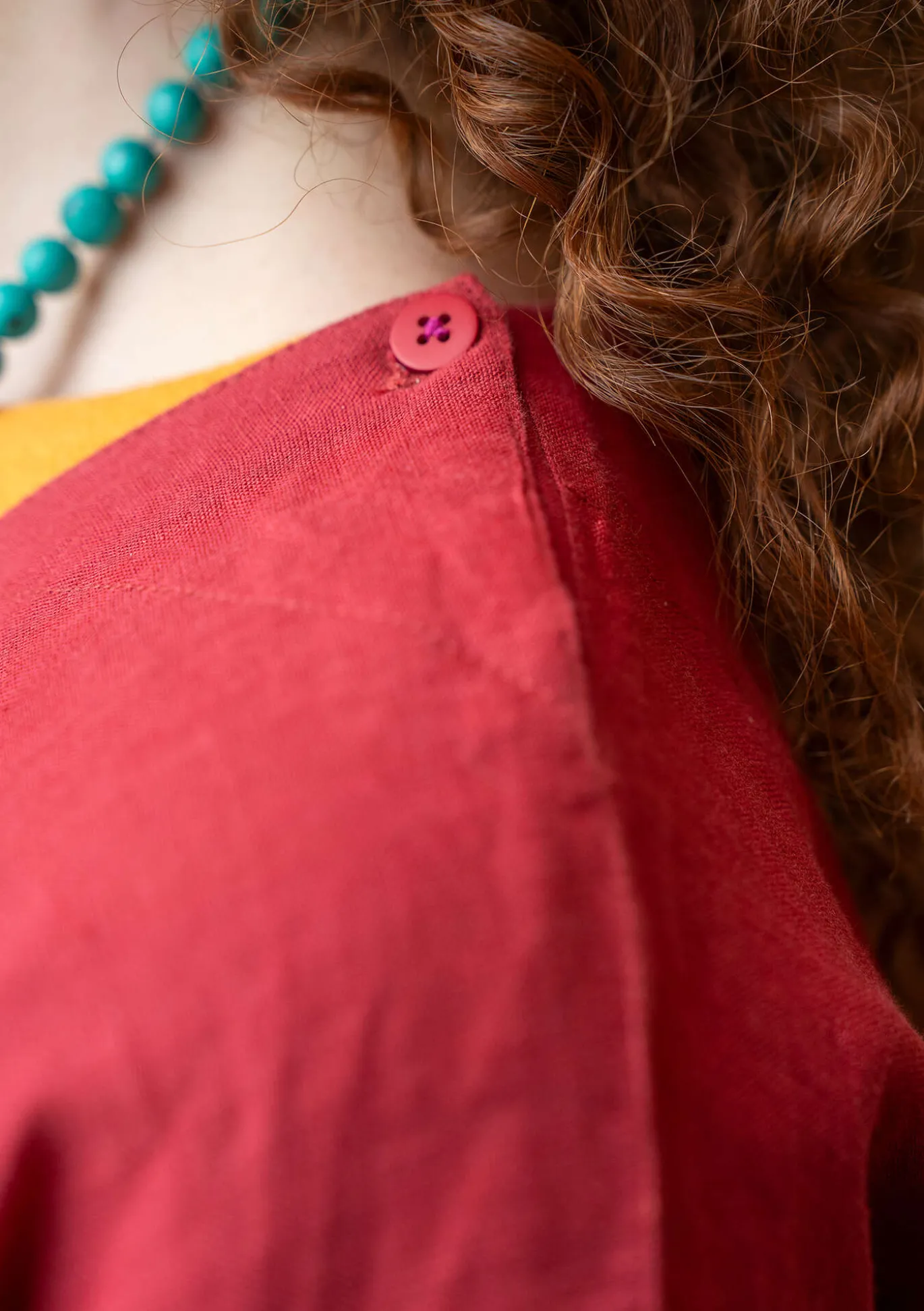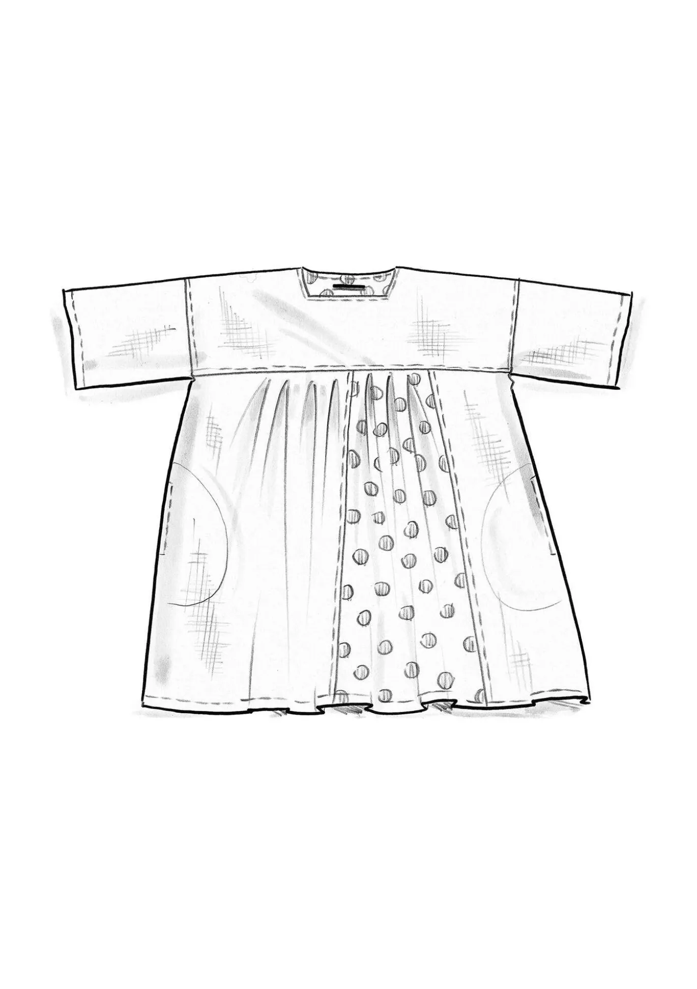Tunikan leikkauksen yläpuolinen osa on hieman paksumpaa materiaalia. Runsas rypytys luo niin etu- kuin takakappaleiden helmaosaan paljon väljyyttä. Nelikulmaisessa pääntiessä nappikiinnitys. Etukappaleessa sekä niskan sisäpuolella muusta kuosista poikkeava painokuvio. Lyhyehköt 3/4-pituiset hihat.