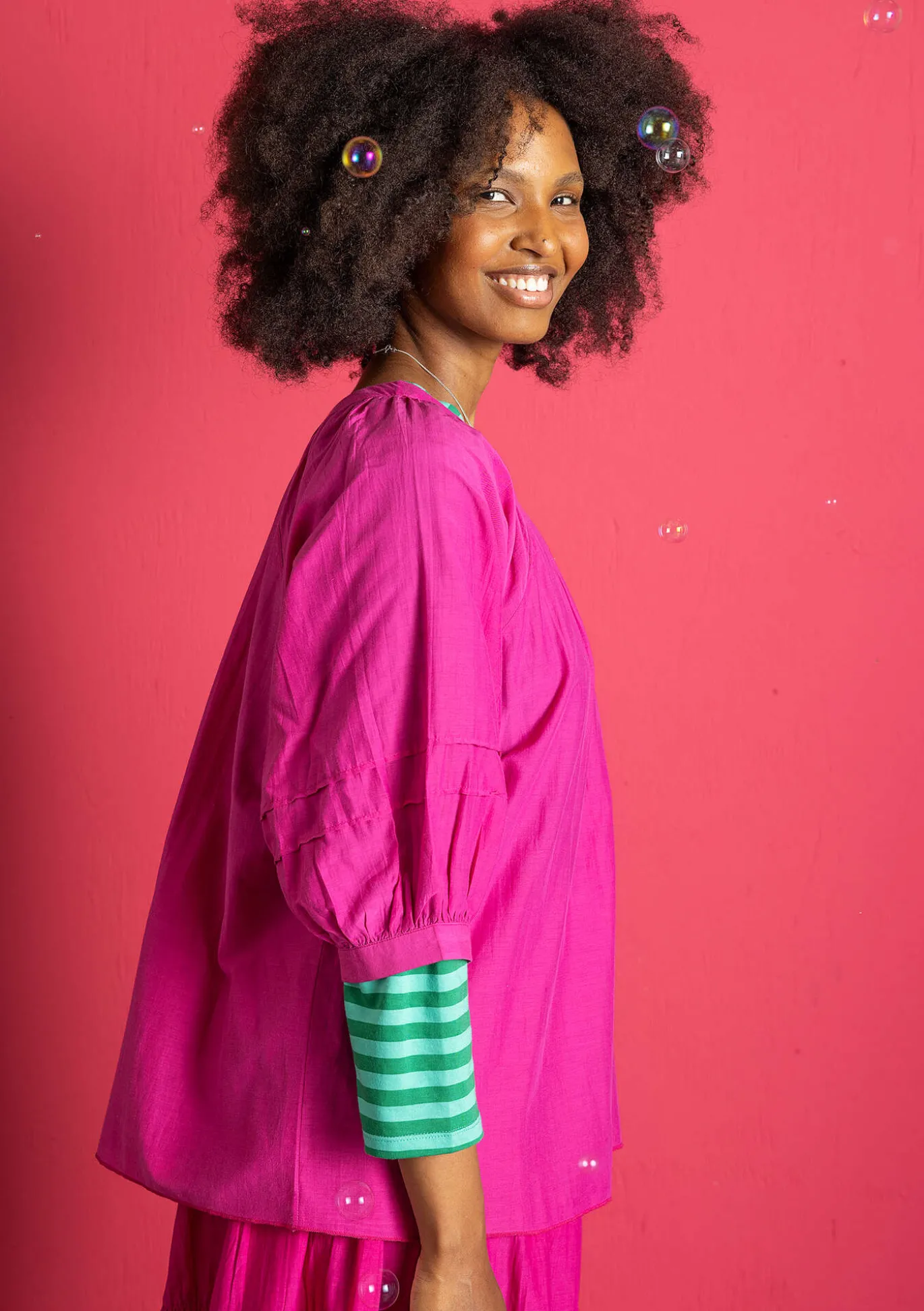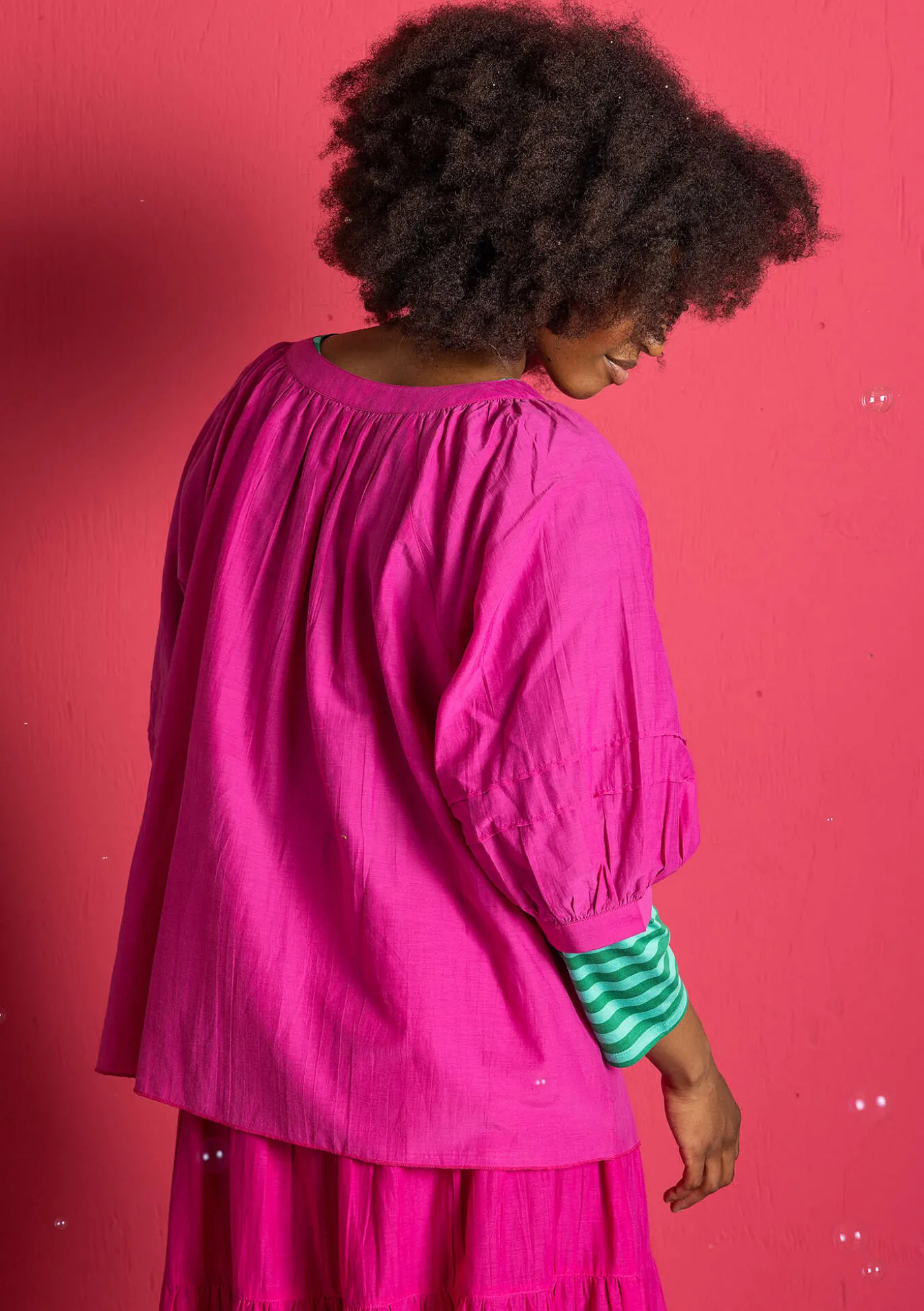 Pussihihainen ja ihanan väljä pusero. Pyöreä pääntie, jossa on rypytys. 3/4-hihat, kaksi laskosta ja rypytys helmassa.