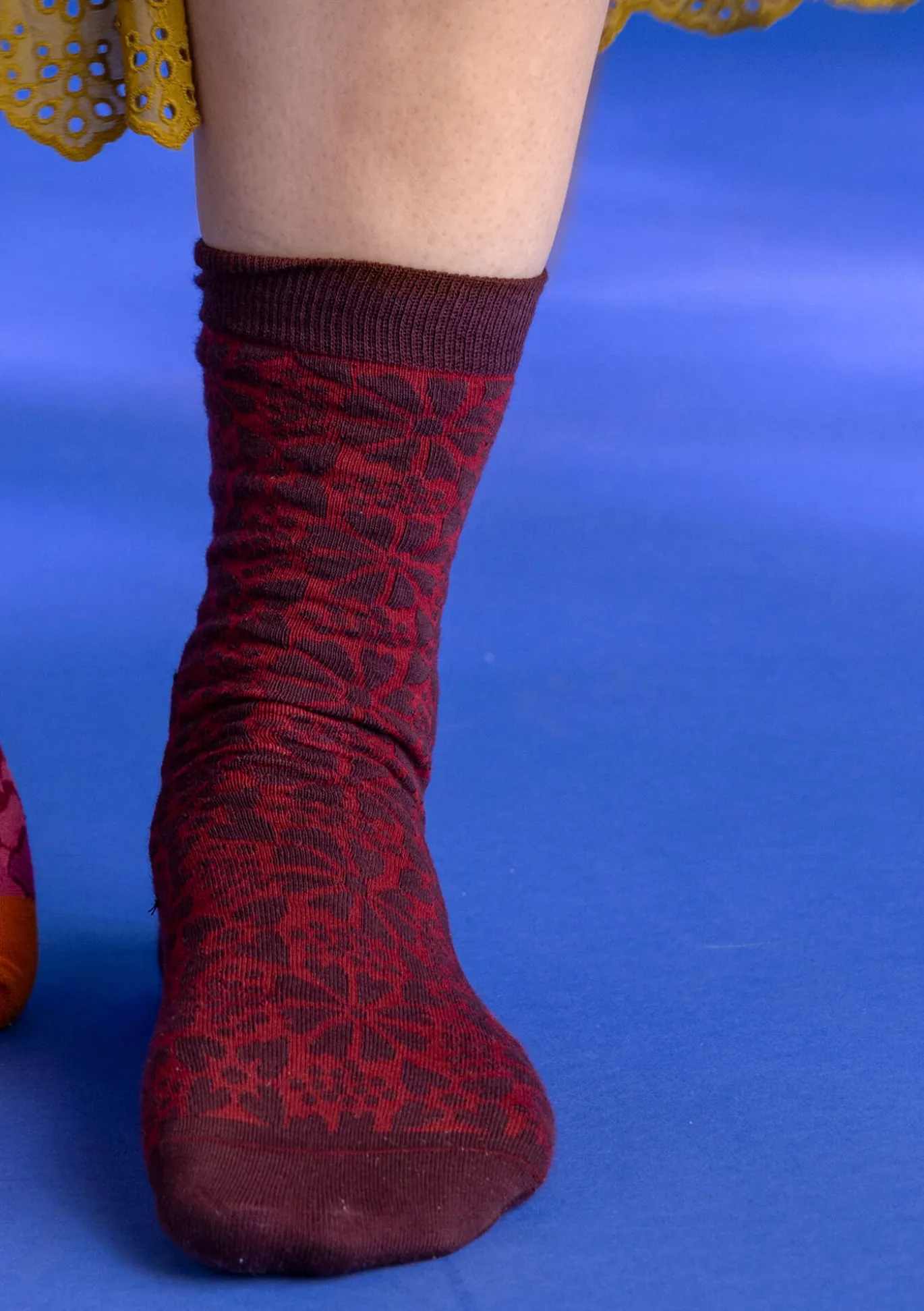 Tätä pikku sukkaa somistaa graafinen folklorehenkinen kukkakuvio. Varrensuussa pehmeä ribbireunus.