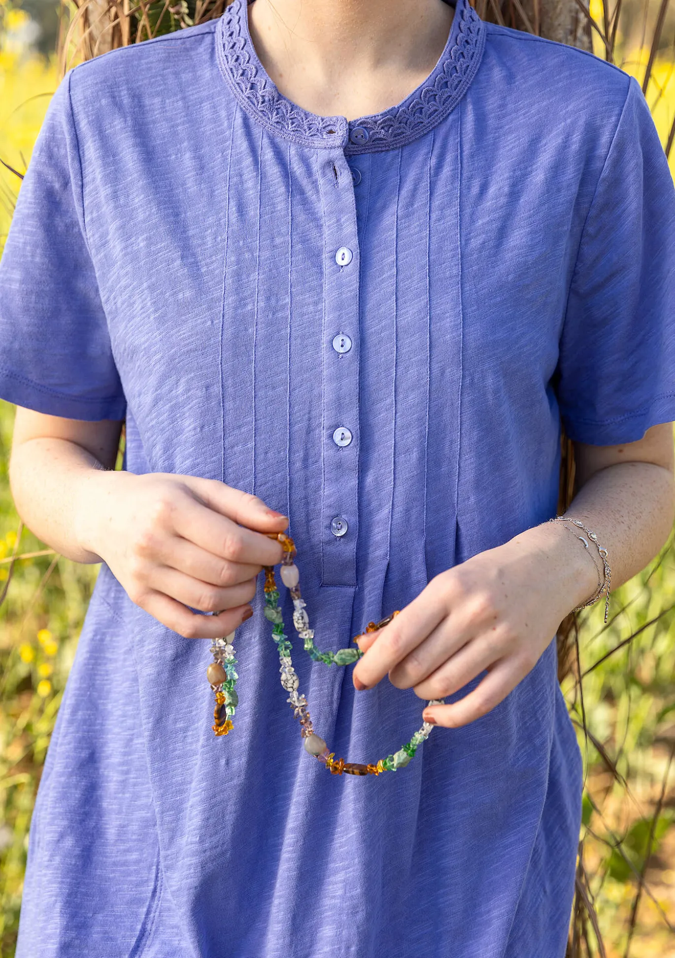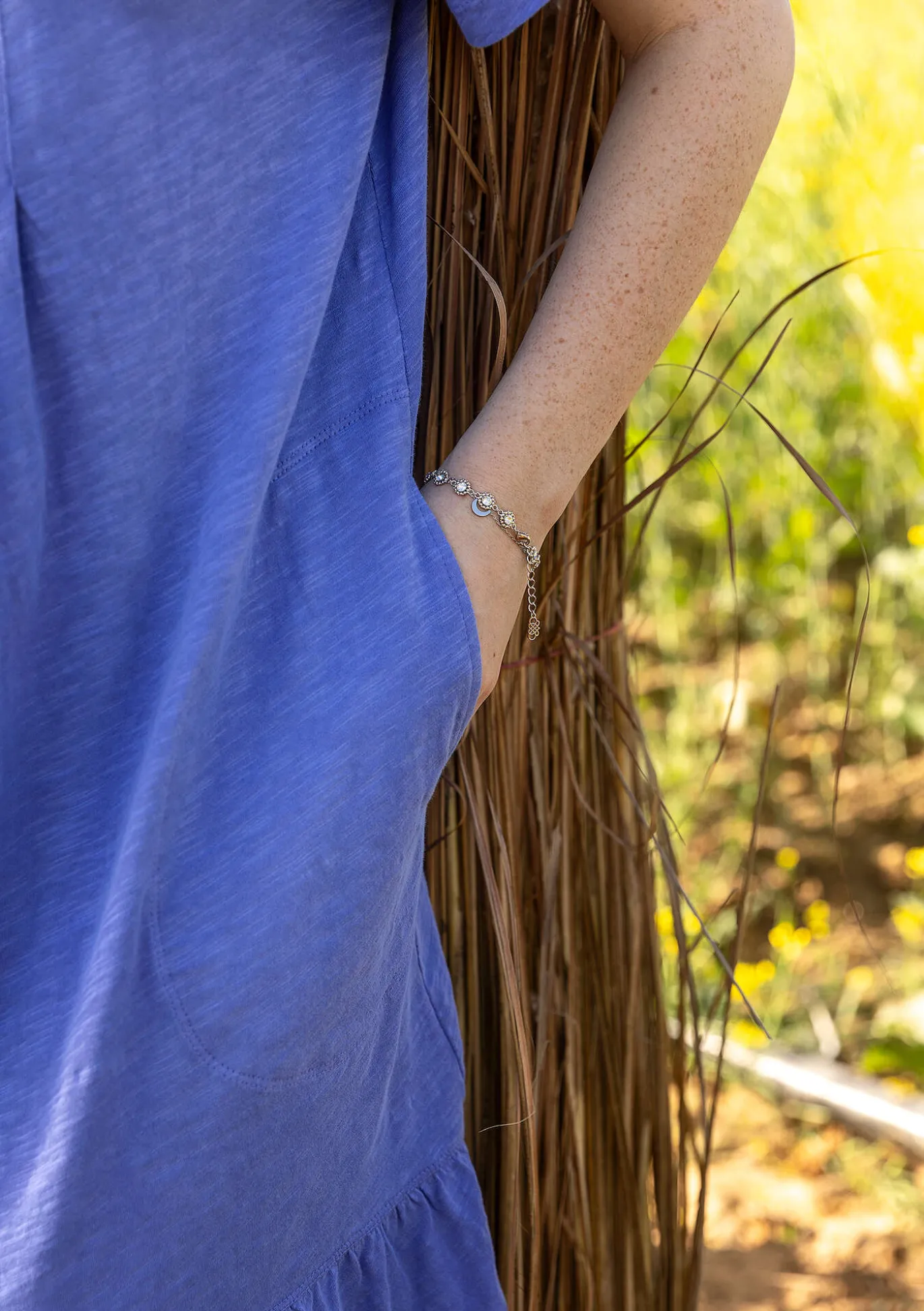 Lyhyet hihat, sivutaskut ja helmassa leveä röyhelö. Yläosassa nappilista ja värjätyt helmiäisnapit. Pystykaulus, jota somistaa romanttinen pitsi. Etu- ja takakappaleessa hiuslaskoksia, jotka antavat helmaan lisäväljyyttä.