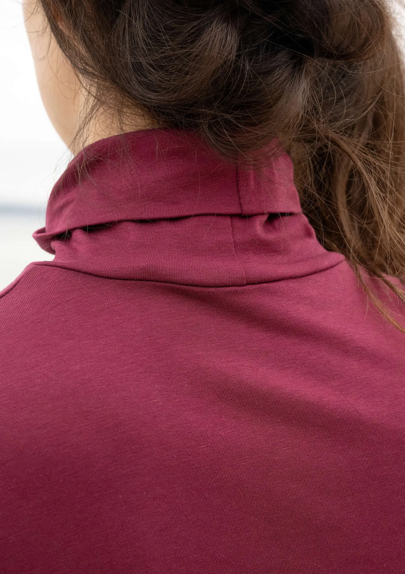 Yksivärinen A-linjainen trikootunika, jossa on poolokaulus ja sivusaumoissa taskut. Hihansuissa resorit, jotka voidaan haluttaessa kääntää ylös.