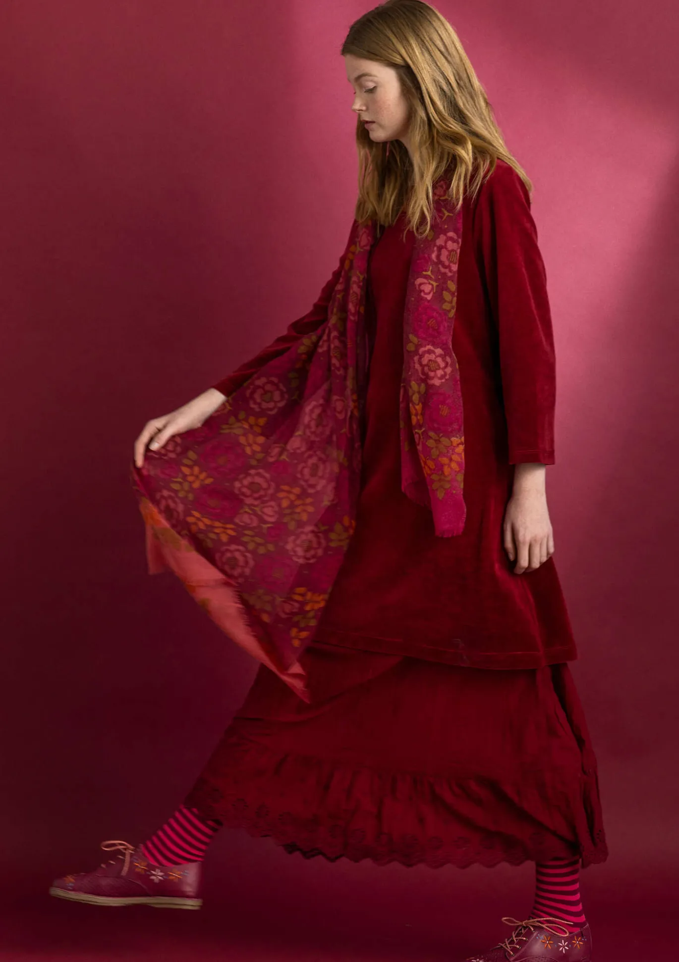 Painokuvioitu huivi pehmeää ja lämmintä villamateriaalia. Kuosia somistaa upea ruusukuvio, joka harvenee ja sekoittuu kauniisti korosteväreihin huivin molemmissa päissä.