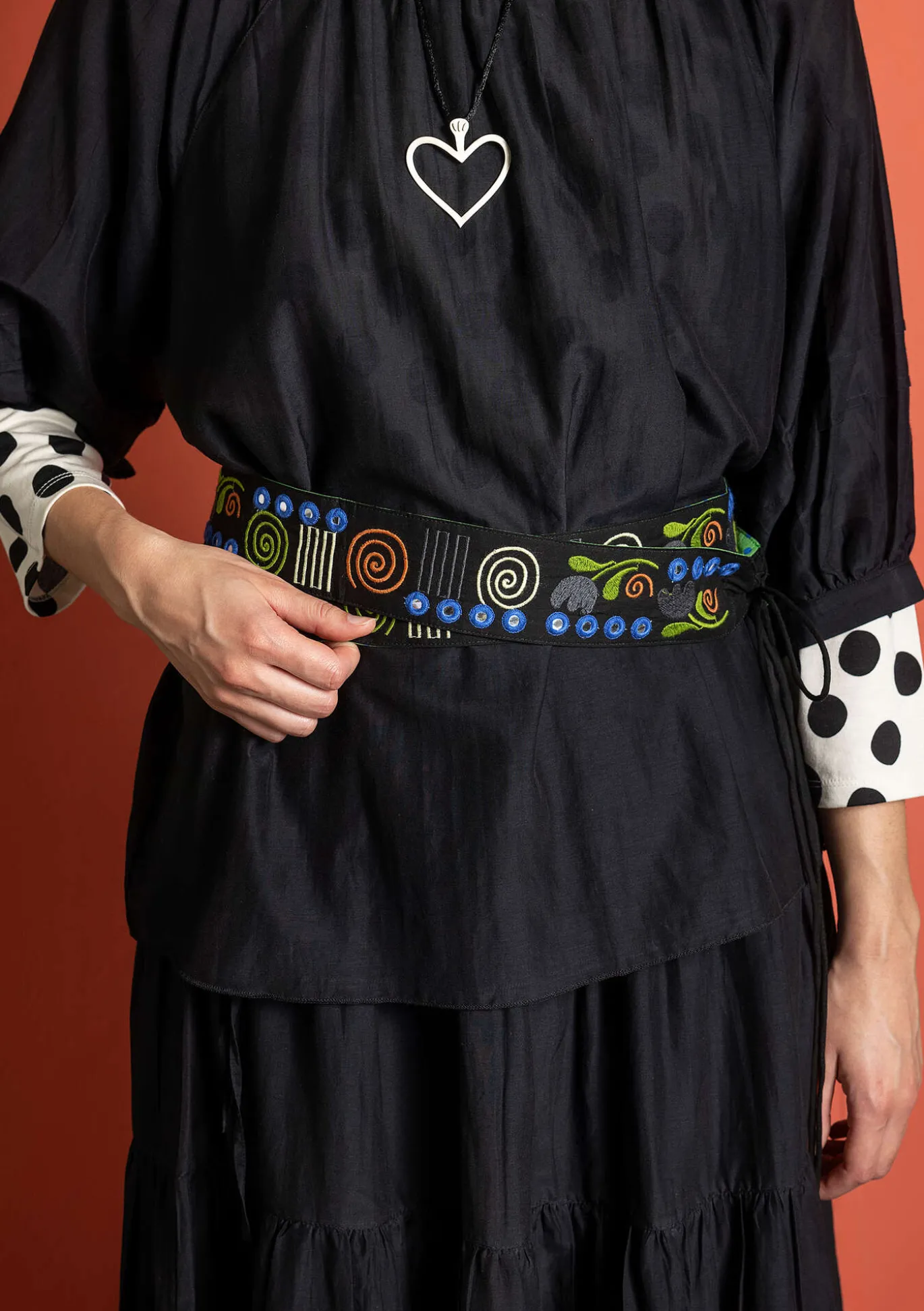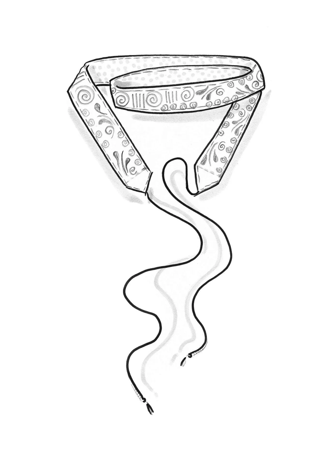 Koristeellinen vyö, jossa on kirjailuja ja peilikirjailuja. Vuori painokuvioitua pilkullista kangasta. Nauhat solmimiseen, päissä koristeelliset langat.